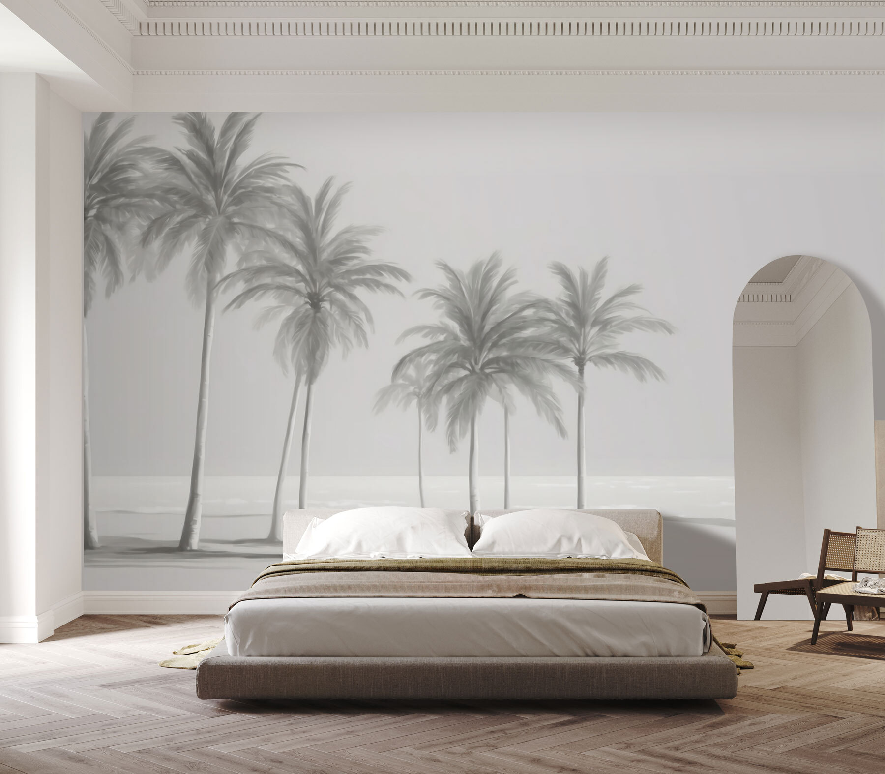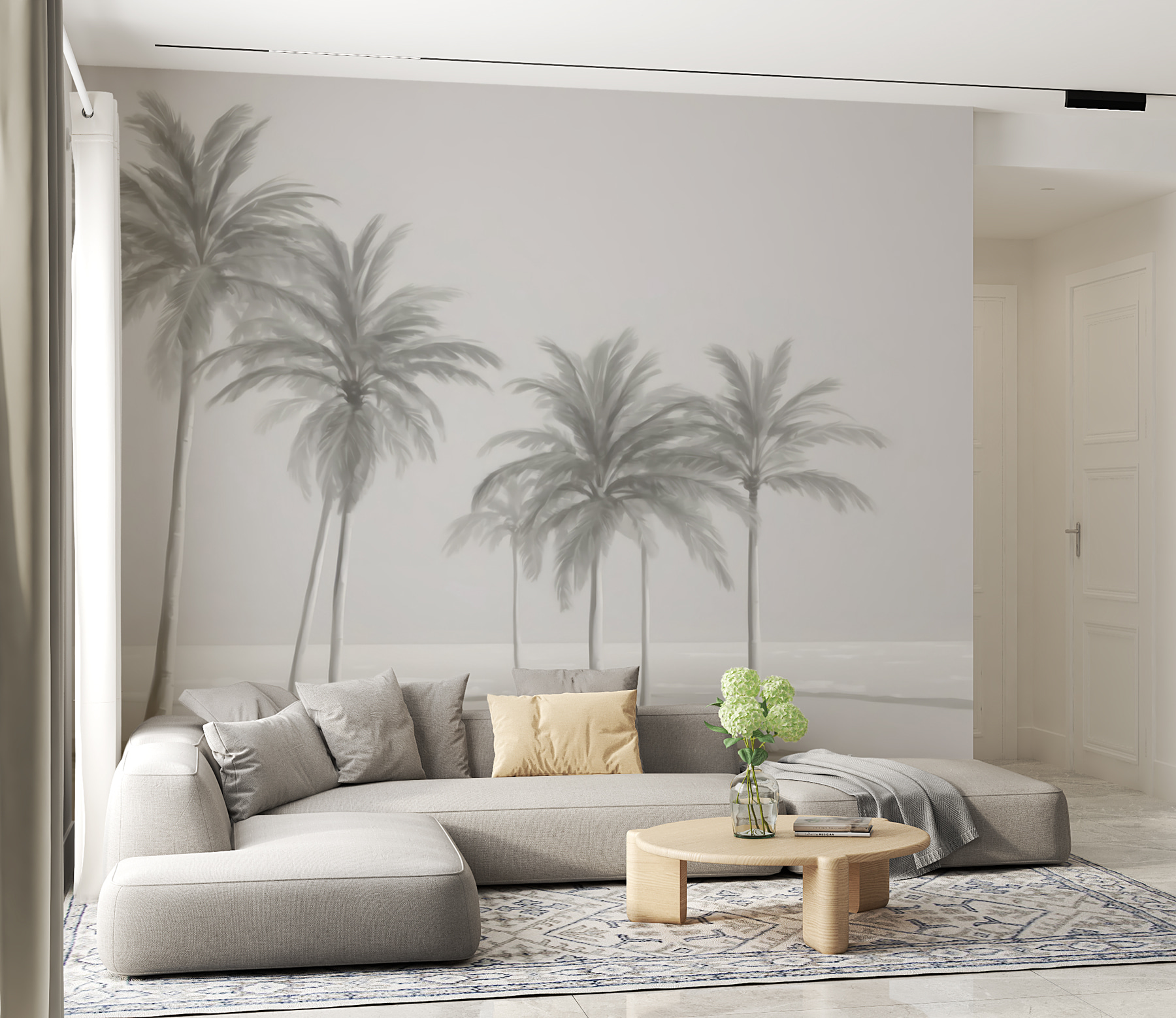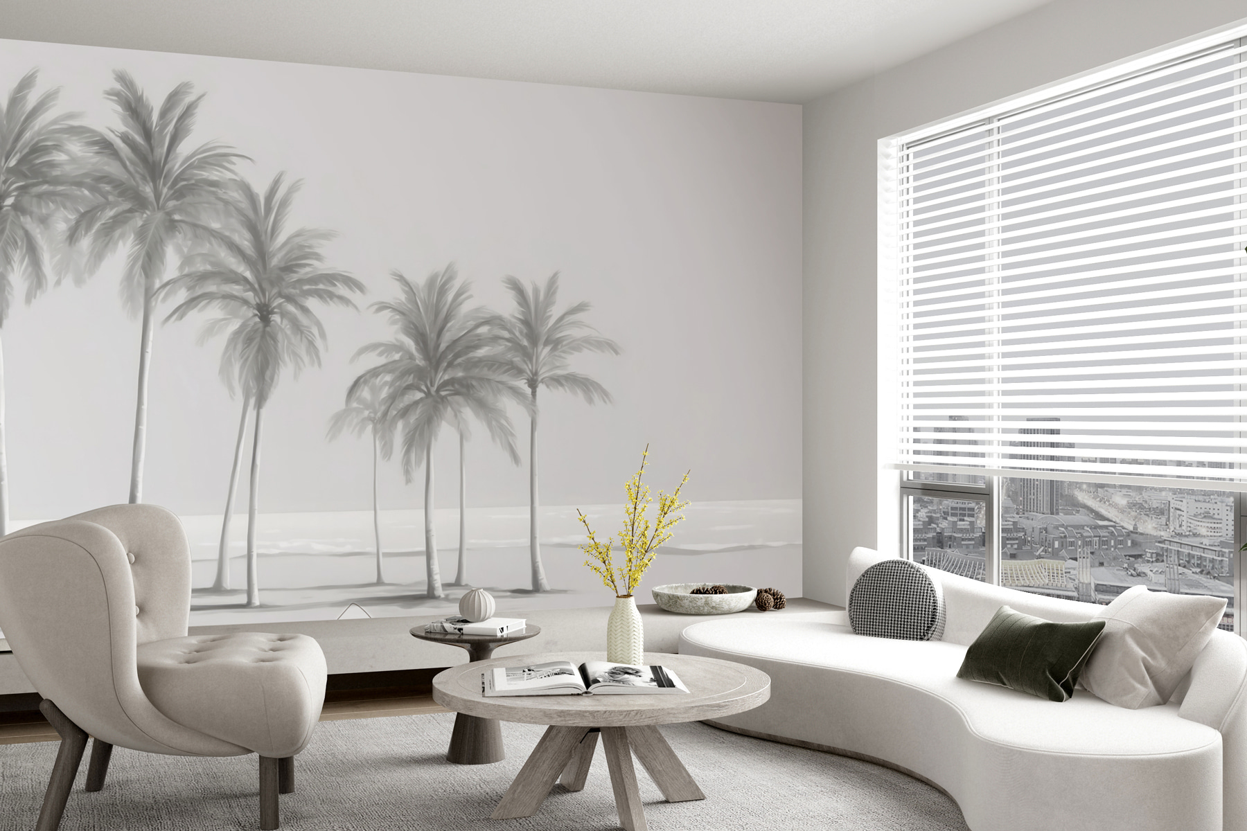 Este mural apresenta uma cena com várias palmeiras altas e elegantes balançando suavemente como se tocadas por uma brisa costeira. As cores suaves e discretas dão-lhe uma sensação quase onírica, um pouco como uma fotografia vintage que capta um dia calmo junto à costa. Encaixa-se perfeitamente em qualquer decoração – moderna, boho, o que quiser. Além disso, é super reconfortante; o tipo de vista que o faz expirar instantaneamente.