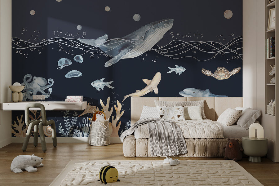Este mural faz maravilhas ao criar uma atmosfera calma mas animada, combinando o melhor da tranquilidade da natureza e da excitação subaquática. É como ter o seu próprio pedaço de mar, mesmo em casa. Mergulhe nesta decoração encantadora e veja como transforma a divisão numa paisagem marítima vibrante!