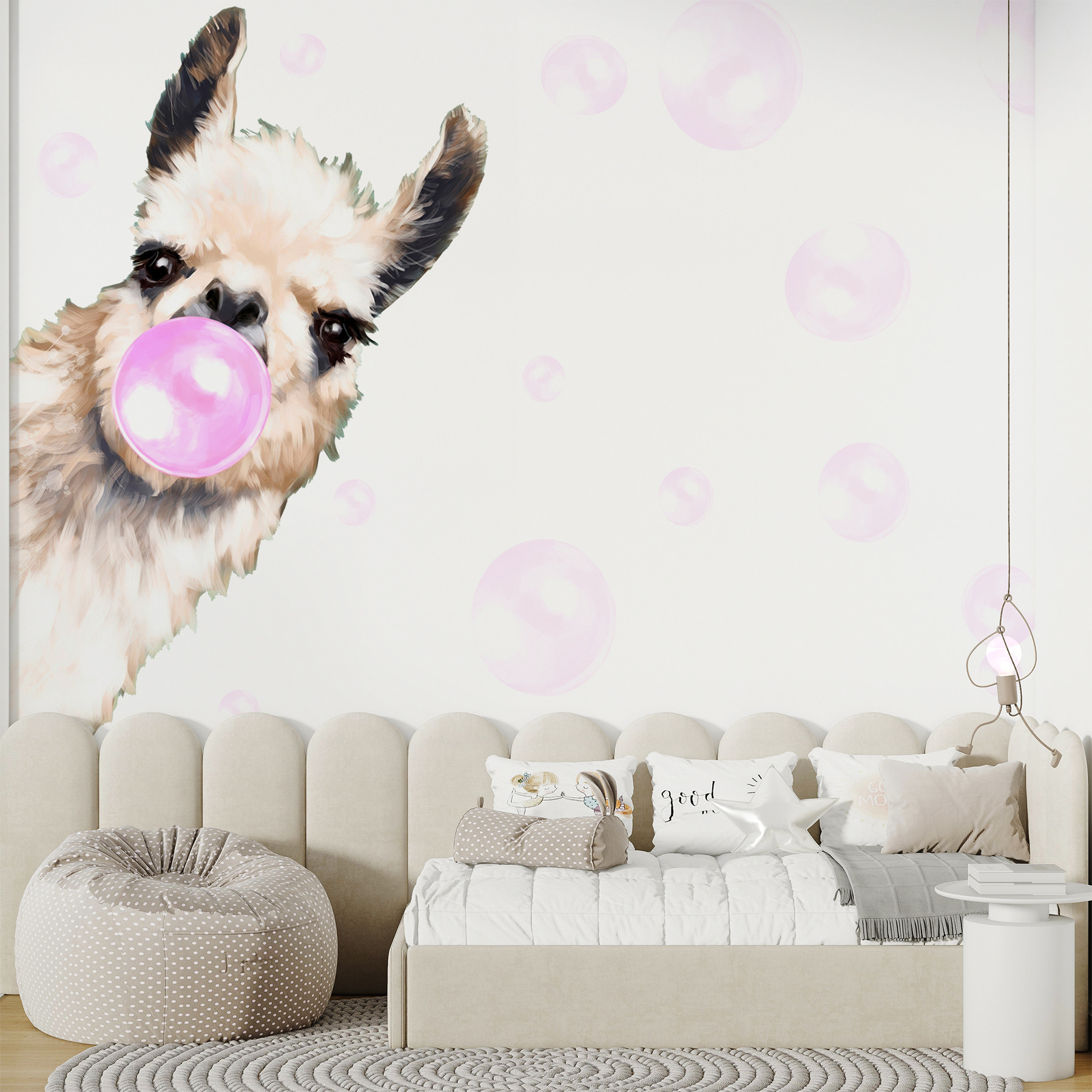 Imagine entrar numa sala e ser recebido por uma lhama a soprar uma bolha cor-de-rosa – é instantaneamente divertido! Este mural não é apenas uma decoração; é como ter um amigo peculiar na sua parede. Perfeito para o quarto de uma filha ou para o local de encontro de um adolescente, capta aquele espírito brincalhão que traz sorrisos. As cores suaves e o design extravagante acrescentam uma vibração alegre, criando um espaço que parece animado mas acolhedor. Imagine a alegria ou as gargalhadas que pode inspirar durante uma noite de cinema. Não é apenas uma parede; é uma experiência à espera de acontecer. Perfeito para quem quer injetar um pouco de alegria no seu espaço.