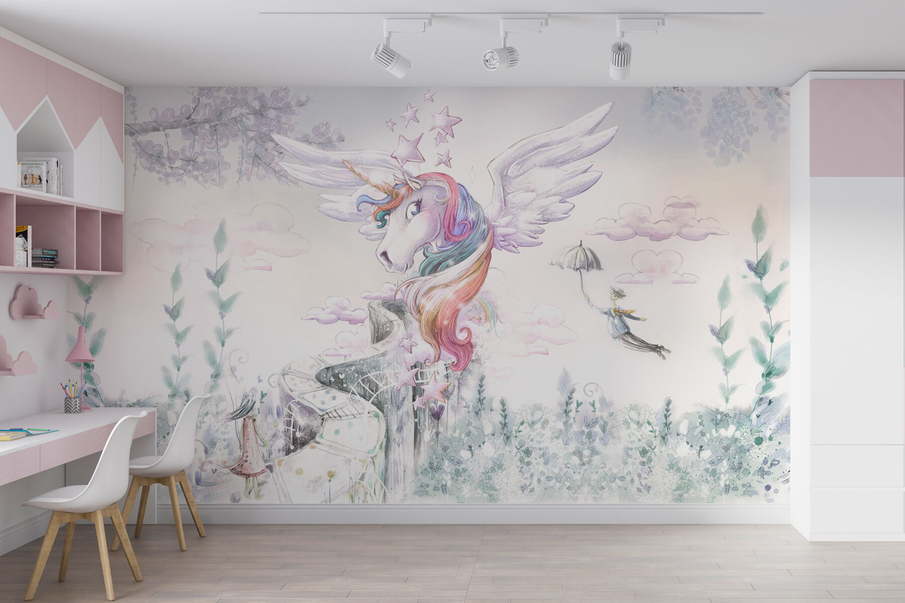 Procura um toque de magia para o quarto do seu filho? Veja este mural “Unicórnio com asas e cabelo arco-íris”! Imagine acordar com uma cena diretamente de um conto de fadas – um unicórnio caprichoso com cabelo arco-íris em tons pastel, rodeado por nuvens suaves e estrelas cintilantes. É como o sonho de qualquer criança, pintado na sua parede! Este mural adapta-se lindamente a infantários e quartos de crianças pequenas, fazendo com que pareça que saltaram para o seu livro de histórias favorito. Docemente discreto, mas totalmente encantador – desperta alegria e histórias sem fim. Perfeito para o país das maravilhas de um pequeno ou o refúgio de qualquer amante de unicórnio! 🌈🦄
