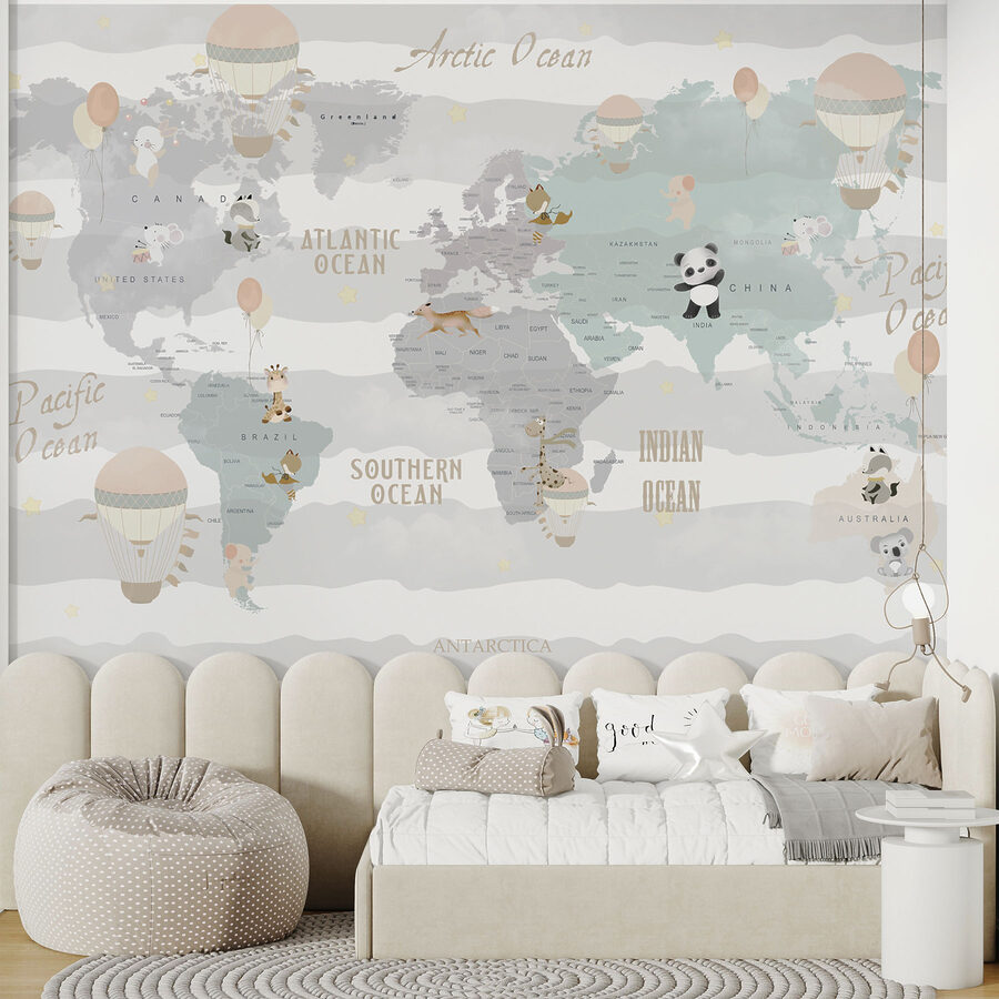 Este adorável mural de parede “Hot Air Balloon in the Sky” levará a imaginação do seu filho para uma aventura mágica. Imagine um mapa-mundo, lindamente suave e em tons pastel, coberto com as criaturas mais bonitas em balões de ar quente – há até um panda brincalhão e uma girafa curiosa! É como um safari global mesmo na parede. Perfeito para um quarto de criança ou para um quarto de criança brincalhão, este mural incentiva a admiração pelo mundo grande e vasto. É garantido que inspirará histórias para adormecer sobre voar sobre os oceanos cintilantes e aterrar em terras distantes. Ideal para os pequenos exploradores – os pais também podem dar por si a sonhar acordados. É acolhedor, caprichoso e cheio de charme – exatamente o que o espaço de cada criança precisa!