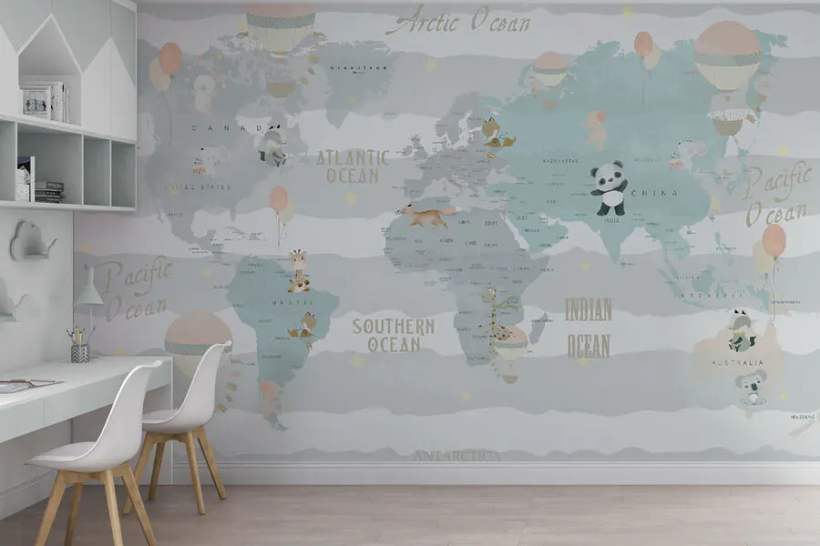 Este adorável mural de parede “Hot Air Balloon in the Sky” levará a imaginação do seu filho para uma aventura mágica. Imagine um mapa-mundo, lindamente suave e em tons pastel, coberto com as criaturas mais bonitas em balões de ar quente – há até um panda brincalhão e uma girafa curiosa! É como um safari global mesmo na parede. Perfeito para um quarto de criança ou para um quarto de criança brincalhão, este mural incentiva a admiração pelo mundo grande e vasto. É garantido que inspirará histórias para adormecer sobre voar sobre os oceanos cintilantes e aterrar em terras distantes. Ideal para os pequenos exploradores – os pais também podem dar por si a sonhar acordados. É acolhedor, caprichoso e cheio de charme – exatamente o que o espaço de cada criança precisa!