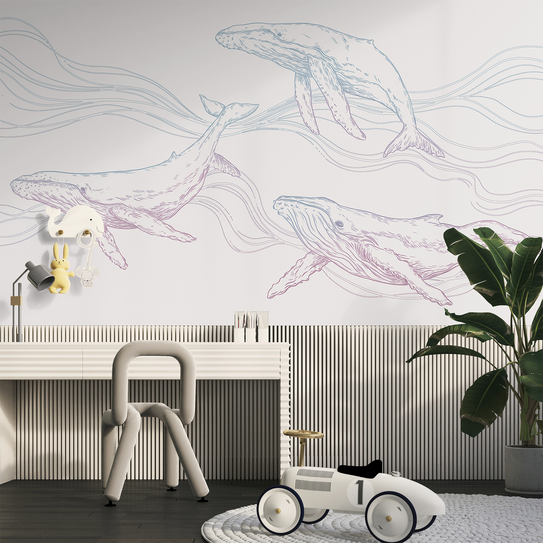 Transforme qualquer divisão numa fuga para o oceano com este deslumbrante mural de parede com um grupo de baleias a nadar graciosamente na água. Imagine-se a acordar com a presença suave e tranquilizadora destas criaturas majestosas, cada uma delas uma recordação da beleza do azul profundo. As linhas suaves e fluidas e os tons pastel criam uma vibração serena – perfeita para uma sala de estar acolhedora ou um retiro calmante no quarto. É como ter um pedaço do mar mesmo em casa. Os amigos vão ficar maravilhados com a arte, e quem não se sentiria um pouco mais relaxado rodeado pelos gigantes da natureza? Mergulhe num mundo que traz as maravilhas do oceano para a sua vida quotidiana.