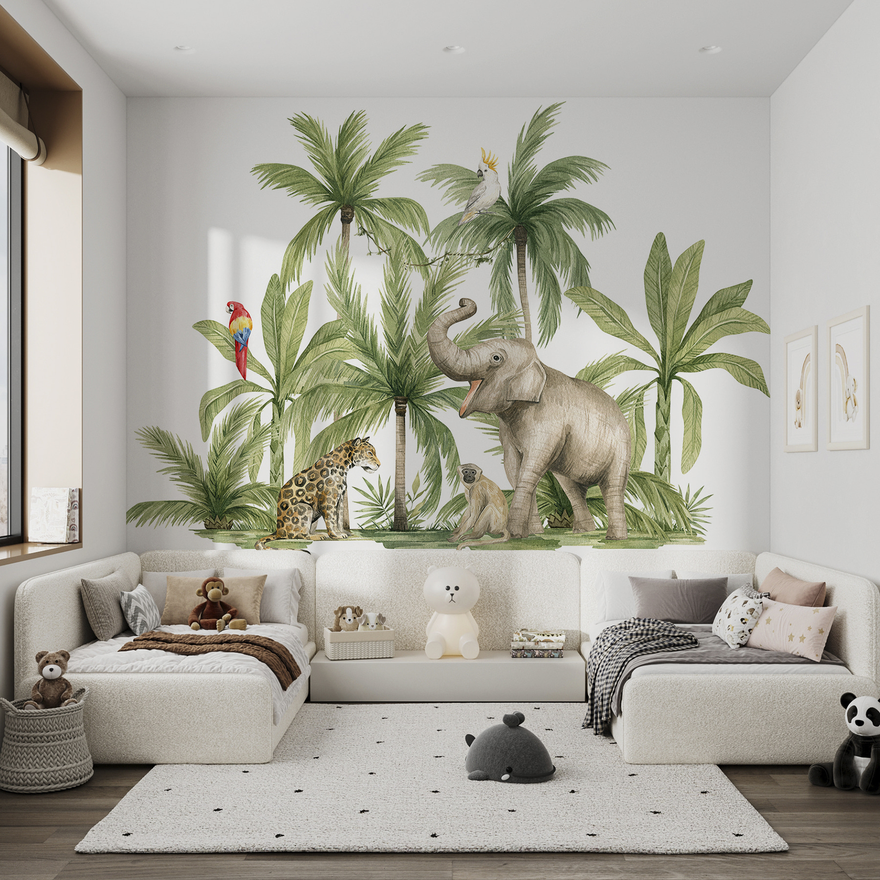 Transforme qualquer divisão numa vibrante aventura na selva com este mural de parede caprichoso com animais divertidos entre palmeiras ondulantes. Imagine entrar num espaço onde um elefante, um macaco atrevido e um papagaio colorido o cumprimentam – quem não sorriria com isso? Perfeito para quartos de crianças ou mesmo para um canto acolhedor na sua sala de estar, acrescenta um toque de encanto da natureza. Além disso, quem poderia resistir à vibração calmante da vegetação luxuriante? Sente-se e deixe que esta cena da selva desperte alegria e riso, transformando os momentos do dia a dia em mini aventuras. Abrace o lado selvagem, nem que seja só por um momento!