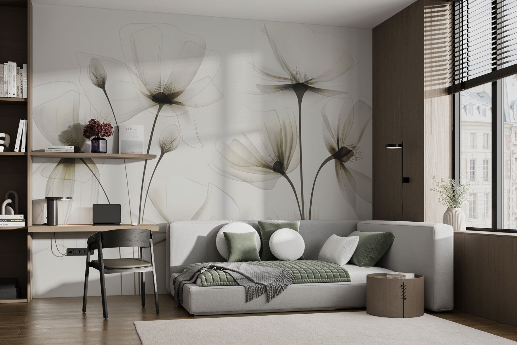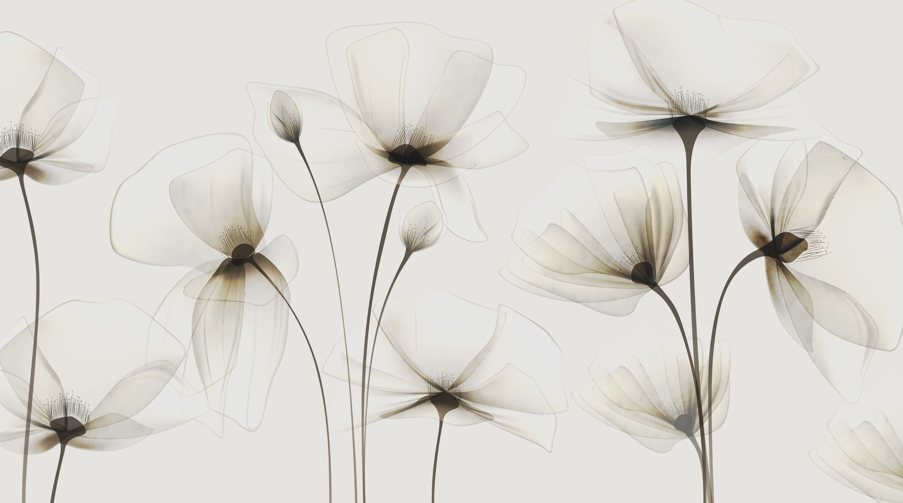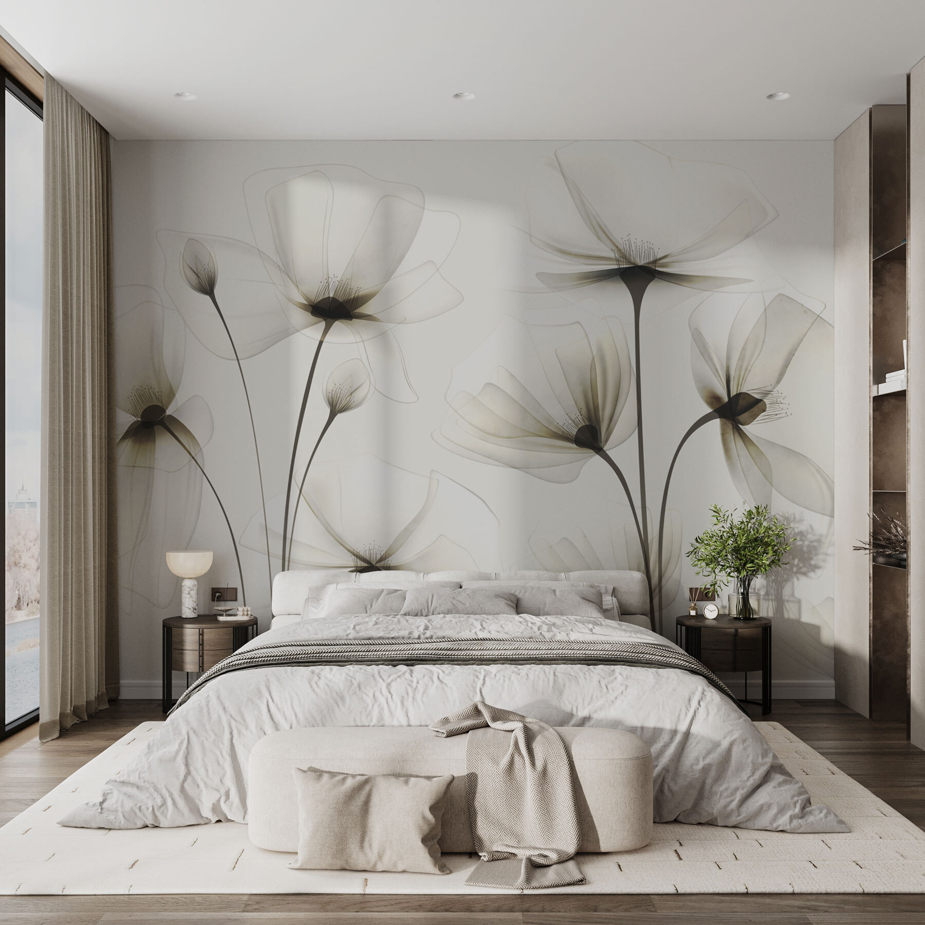 Sente que as suas paredes precisam de um pouco de magia? Veja este mural de parede com estas flores tão delicadas que quase parecem flutuar no ar. As pétalas suaves e transparentes num fundo branco limpo dão uma vibração tão serena e calmante. Imagine acordar com esta beleza todos os dias – como ter o seu próprio jardim tranquilo sem toda a rega.