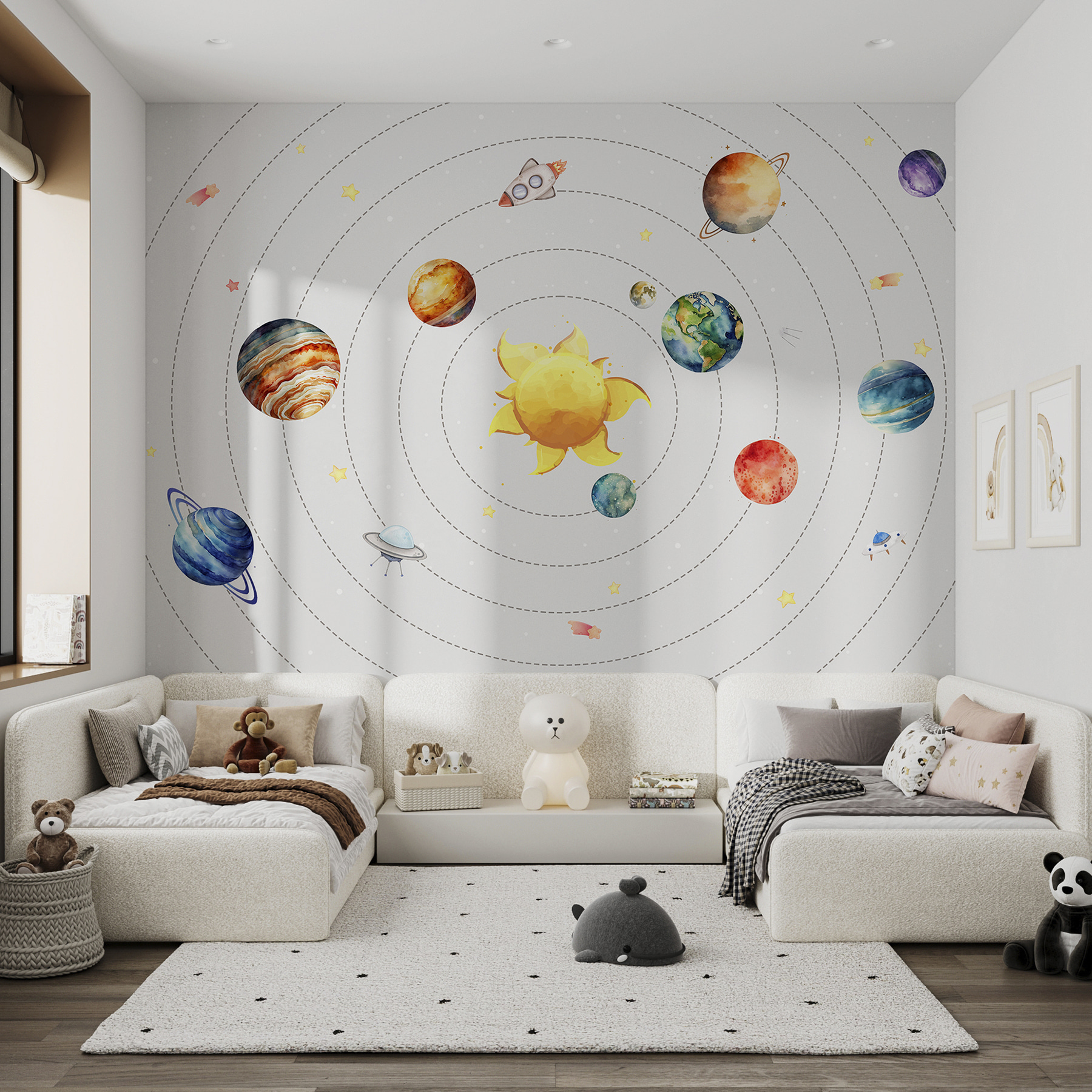 Transforme qualquer espaço num país das maravilhas cósmico com este mural de parede vibrante. Com uma representação divertida em aguarela do nosso sistema solar, convida os pequenos sonhadores a imaginar aventuras entre as estrelas. O sol alegre, os planetas coloridos e o foguetão caprichoso despertam a curiosidade e a criatividade. Imagine um recanto de leitura acolhedor ou um quarto onde a galáxia está apenas a um olhar de distância. É como ter um pedaço de espaço na parede, pronto para inspirar grandes sonhos. Quem sabe? Talvez um dia o seu filho venha a ser o próximo explorador do espaço!