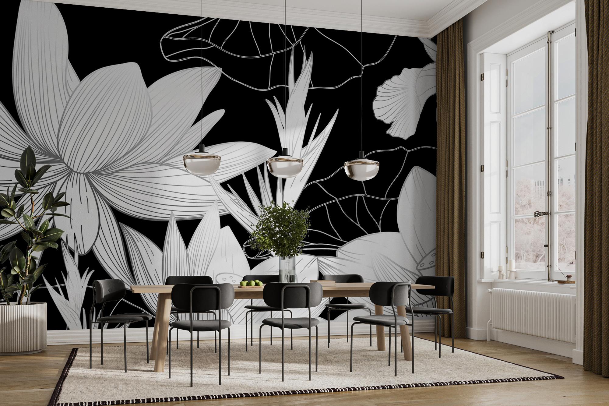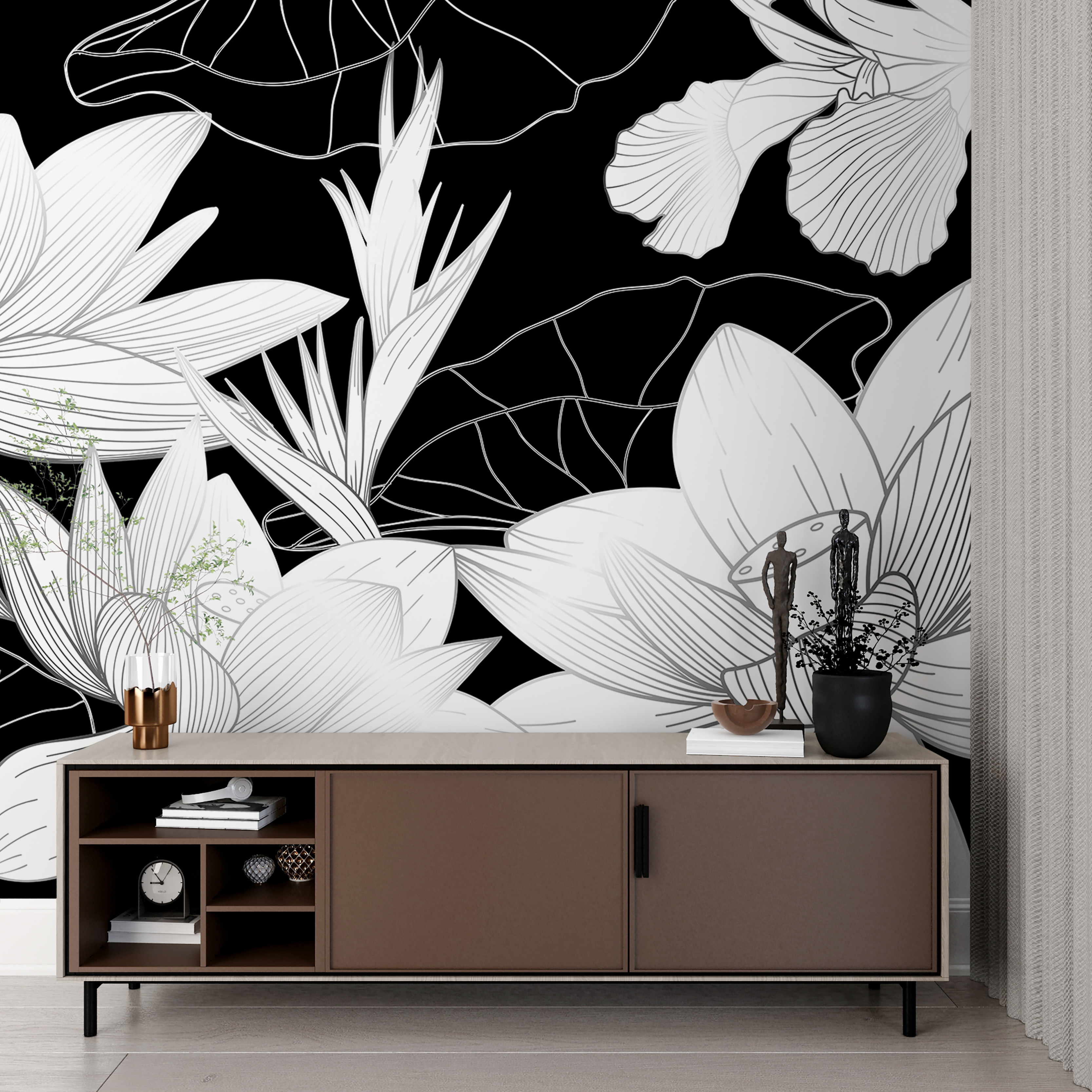 Muito bem, imagine o seguinte: está sentado no seu quarto, mas ainda não se sente como “você”. Talvez precise de um toque final para se sentir especial. Entre no elegante mural floral a preto e branco – um deslumbrante revestimento de parede que acrescentará sofisticação e estilo a qualquer espaço. Quer dizer, basta olhar para aquelas flores! Não são flores comuns; têm aquele toque artístico que diz: “esta sala? É algo diferente”.