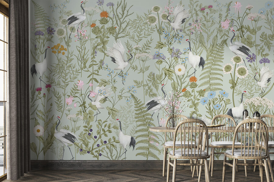 Quer seja um amante da natureza ou apenas alguém que gosta de um pouco de capricho, este mural tem tudo o que precisa. A mistura de vegetação e flores coloridas cria uma sensação serena de bosque – ideal para criar um canto tranquilo onde pode descontrair com um bom livro ou uma chávena de chá. Além disso, há algo de chique e sem esforço nos pássaros brancos contra todo aquele verde. É como ter um pequeno pedaço de uma floresta encantada mesmo em sua casa.