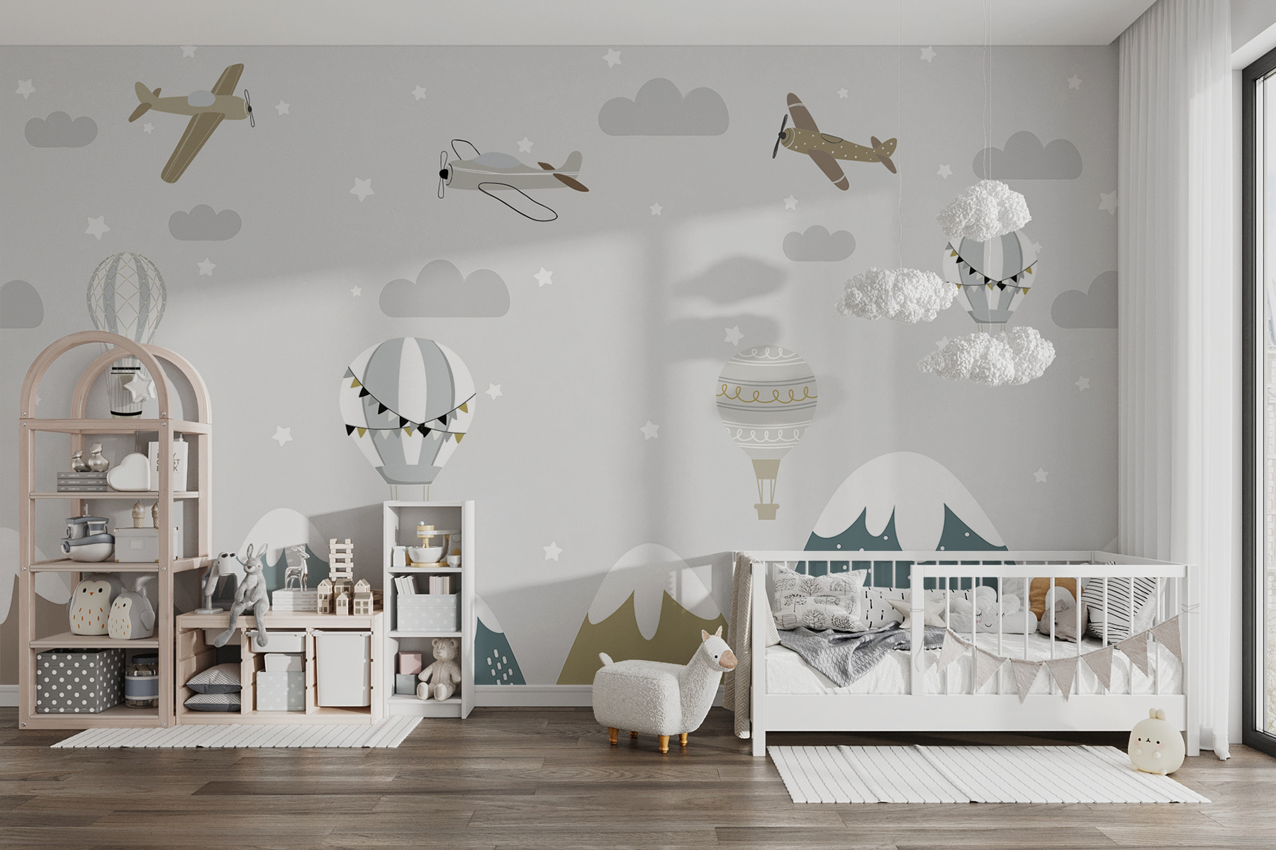 Perfeito para um quarto de bebé ou de brincar, acrescenta um toque de aventura e muito charme. Os pequenos aviões parecem prontos para levar o seu filho numa viagem aérea, enquanto os balões de ar quente flutuam suavemente, acrescentando uma sensação de serenidade. Este mural não se limita a decorar – conta uma história.