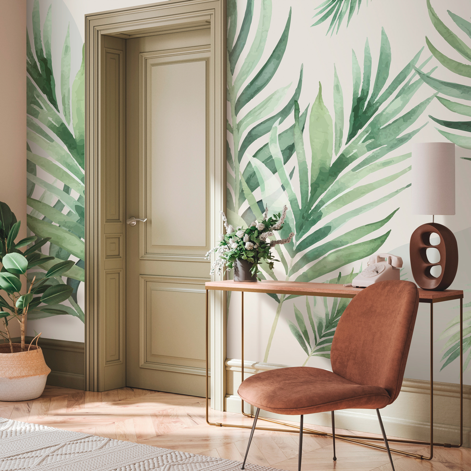 Transforme qualquer espaço num retiro tropical com este encantador mural de parede de suaves folhas de aguarela. Imagine acordar todas as manhãs com o balanço suave das folhas de palmeira a dançar nas suas paredes, como se estivesse de férias numa estância balnear tranquila. Os verdes subtis convidam a uma sensação de calma, iluminando sem esforço a sua casa – não é necessário protetor solar! Imagine um recanto de leitura acolhedor onde bebe o seu café enquanto contempla este cenário exuberante. É como trazer um pouco da selva para dentro de casa, sem os mosquitos. Perfeito para quem deseja a natureza, mas também gosta de ficar em casa.