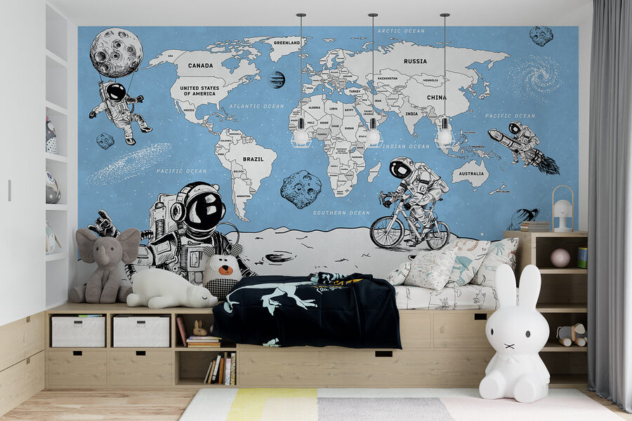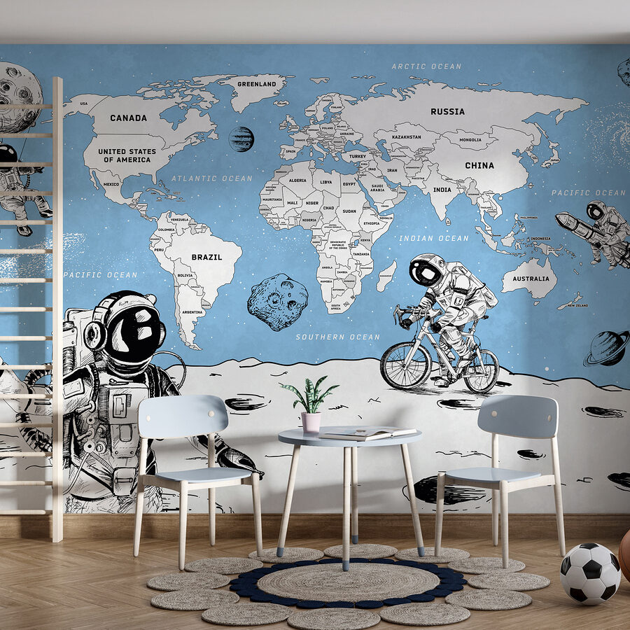 Imagine este mural de parede a iluminar o seu quarto – é como entrar num mundo totalmente novo! Tem este desenho de um astronauta a pedalar uma bicicleta mesmo na lua, com a Terra a flutuar suavemente no fundo. É peculiar, vibrante e um pouco mágico. Perfeito para crianças, ou para quem ainda é uma criança no coração.