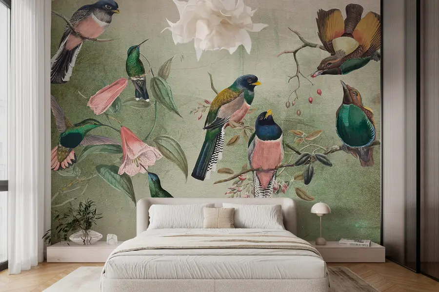Imagine acordar com uma alegre serenata de pássaros coloridos empoleirados em ramos – sem nunca ter de sair da sua cama acolhedora! Este mural “Grupo de Pássaros num Ramo” é como ter uma pequena fatia da natureza mesmo na sua sala de estar. A bela mistura de pássaros e flores dá esta vibração tranquila, mas animada, que só o faz querer servir uma chávena de chá e sentar-se para um feitiço. Perfeito para os amantes de pássaros ou para qualquer pessoa que queira um toque do ar livre dentro da sua casa. Cada olhar para este mural – um momento de puro deleite. Bónus: não precisa de se preocupar em alimentar estes amigos de penas!