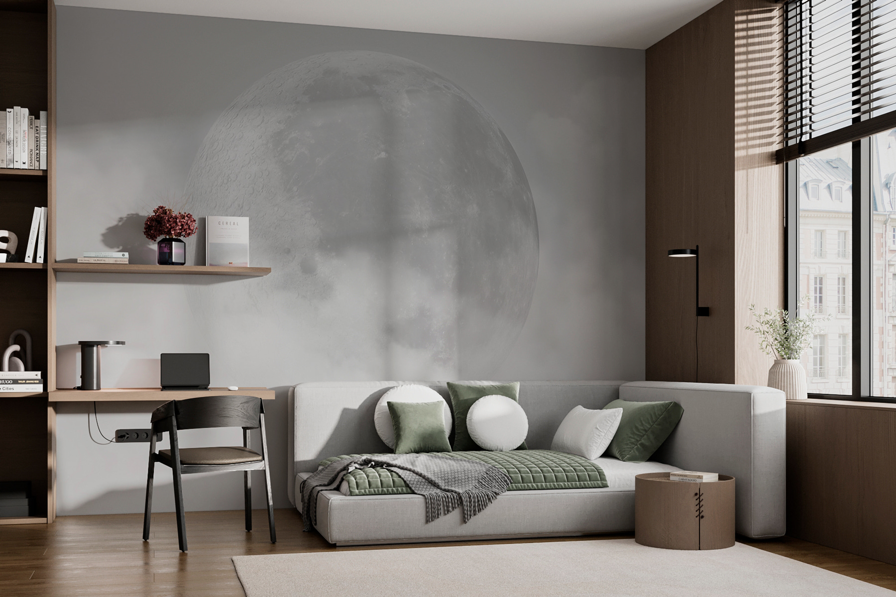 Perfeito para a parede de um quarto ou para um recanto de leitura acolhedor, este mural envolve-o num brilho suave e sereno. O pormenor é espantoso; quase se sente como se pudesse estender a mão e tocar nas crateras da lua! É verdade – um pedaço da galáxia mesmo em sua casa. Quer seja um observador de estrelas ou apenas alguém que gosta de um toque de capricho, é a derradeira fuga sem sair de casa. A mistura subtil de luz e sombra torna-o uma peça versátil, que se enquadra sem esforço em vários temas – desde o chique moderno ao charme rústico.