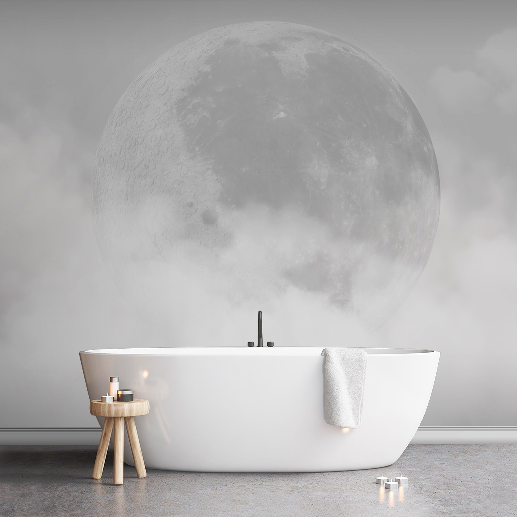 Imagine-se deitado na sua cadeira favorita, talvez com um chá quente na mão, e deixar os seus olhos vaguearem… é isso que este mural faz! A lua espreita por detrás de nuvens delicadas e finas – quase como se estivesse a brincar às escondidas. É sonhador e misterioso, um pouco como uma história de embalar para adultos.