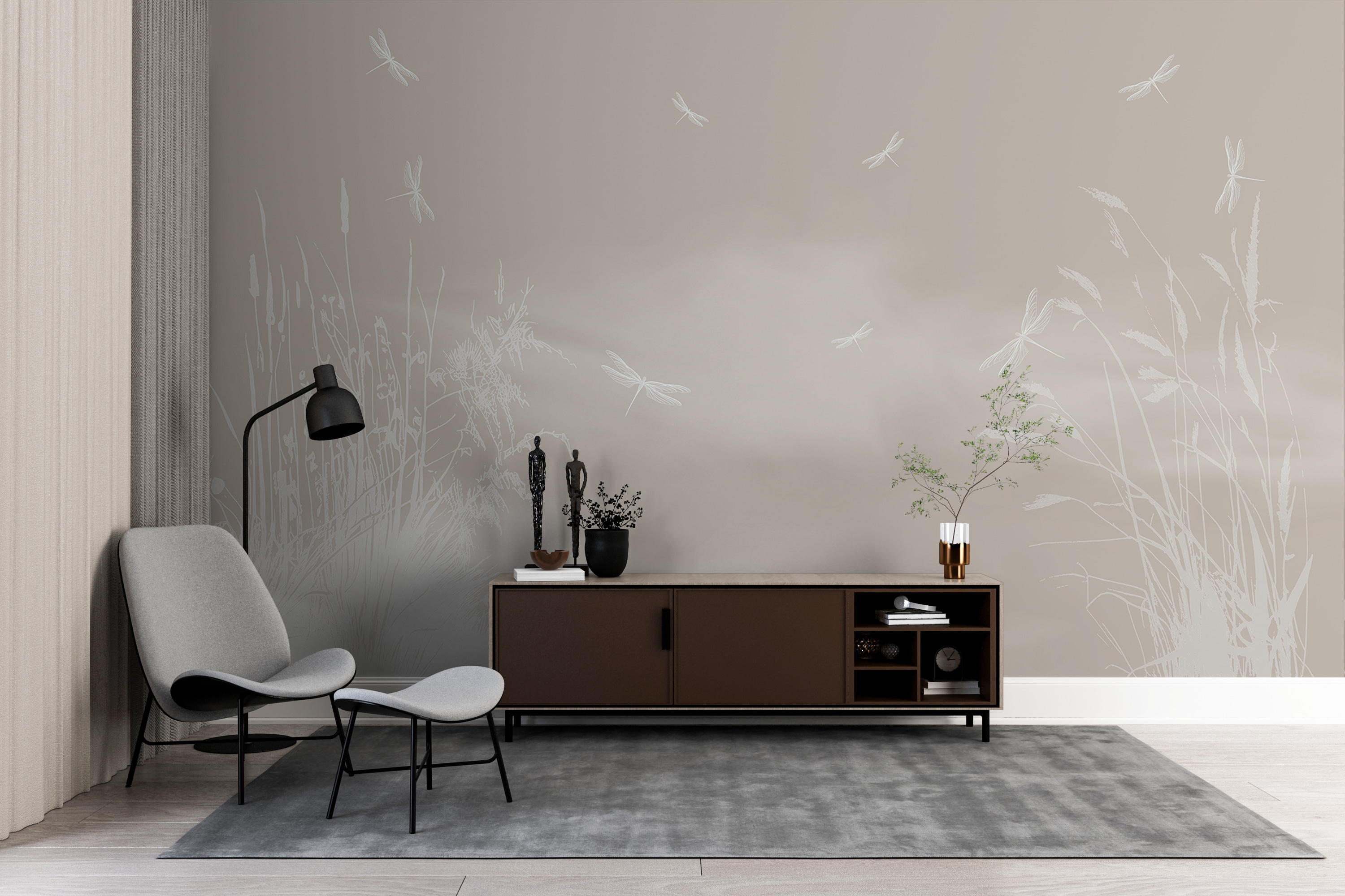 Precisa de algo sonhador para a sua parede? Veja este mural – tem estas delicadas libélulas brancas a esvoaçar neste fundo suave e terroso. É como uma tarde suave num campo, com as libélulas a dançar numa leve brisa. Imagine-se sentado na sua cadeira preferida, com uma chávena de chá na mão, totalmente zen. Tem esta vibração calmante que dá vontade de respirar fundo e relaxar. Perfeito para dar um toque de natureza e tranquilidade ao seu espaço! Confie em mim, vai querer perder-se nela sempre que passar por ela.