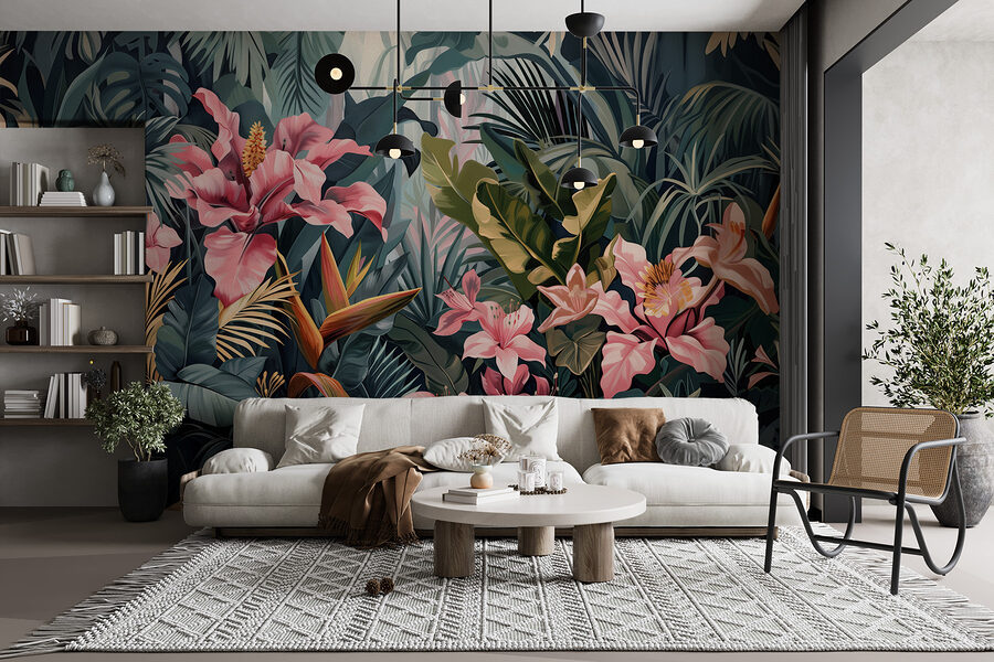 Imagine chegar a casa depois de um longo dia, descalçar os sapatos e ser recebido por uma selva exuberante mesmo na sua sala de estar. É exatamente isso que este mural vibrante proporciona. É como entrar num paraíso tropical – completo com flores cor-de-rosa arrojadas e vegetação rica – sem sair de casa! Perfeito para adicionar um grande fator “uau” a qualquer espaço, quer seja a sala de estar, o quarto ou até mesmo um escritório doméstico chique.