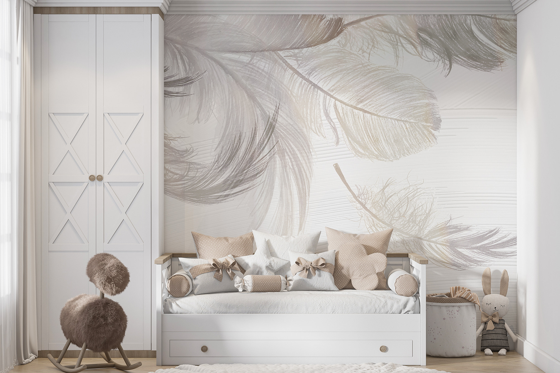 Imagine entrar numa sala onde os suaves sussurros da natureza o abraçam. Este mural, com suaves penas brancas numa superfície tranquila, convida a uma sensação de paz e elegância. É como uma lufada de ar fresco, que eleva o espaço sem esforço. Perfeita para um recanto de leitura acolhedor ou para um quarto calmo, dá um tom sereno que é o ideal para aqueles momentos de relaxamento. Imagine-se a bebericar um chá com um bom livro, sentindo o peso do mundo a desaparecer um pouco. É subtil, mas atraente – como um segredo suave à espera de ser descoberto. Um pequeno toque que faz uma grande diferença!