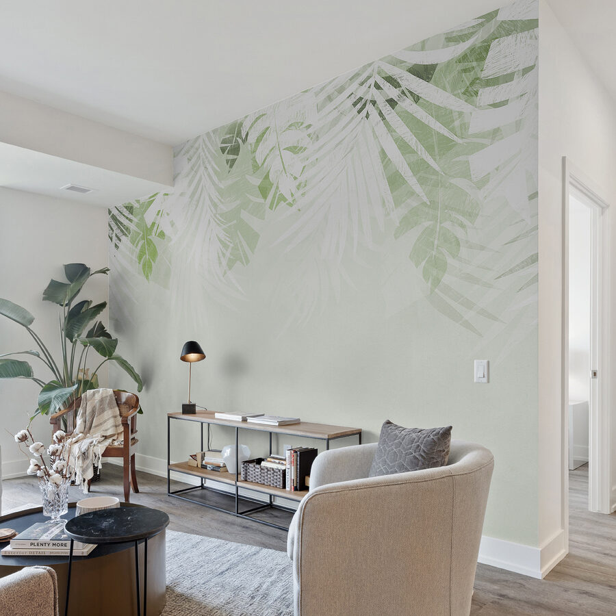Acrescente alguma vegetação, uma cadeira confortável, talvez um bom livro, e voilà – um retiro perfeito e cheio de folhas. Quer seja um habitante da cidade que deseja um toque de natureza ou apenas alguém que adora a estética das folhas, este mural parece uma lufada de ar fresco. Então, porque não trazer um pouco dos trópicos para as suas paredes? Merece-o totalmente.