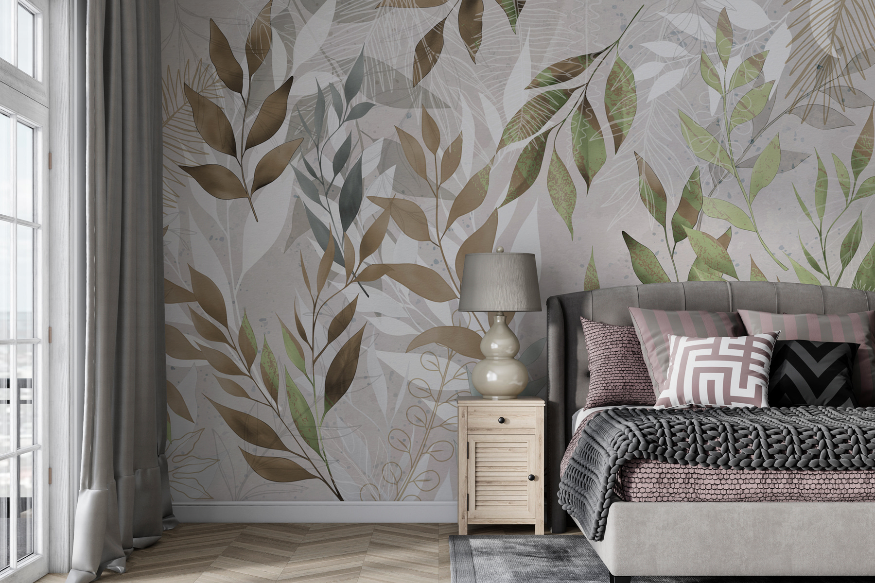 As cores são verdes e castanhos suaves mas vivos, misturados na perfeição para dar aquele aspeto fresco e sem esforço. Sempre que olhar para ela, poderá sentir-se um pouco mais relaxado, como se estivesse a tirar umas mini-férias. Ótimo para pessoas que adoram a beleza da natureza, mas nem sempre podem estar ao ar livre. Este mural não se limita a decorar, cria uma experiência – imagine manhãs aconchegantes com café, ou serões com música suave, rodeado por esta adorável obra de arte com folhas. Perfeito para sonhar.