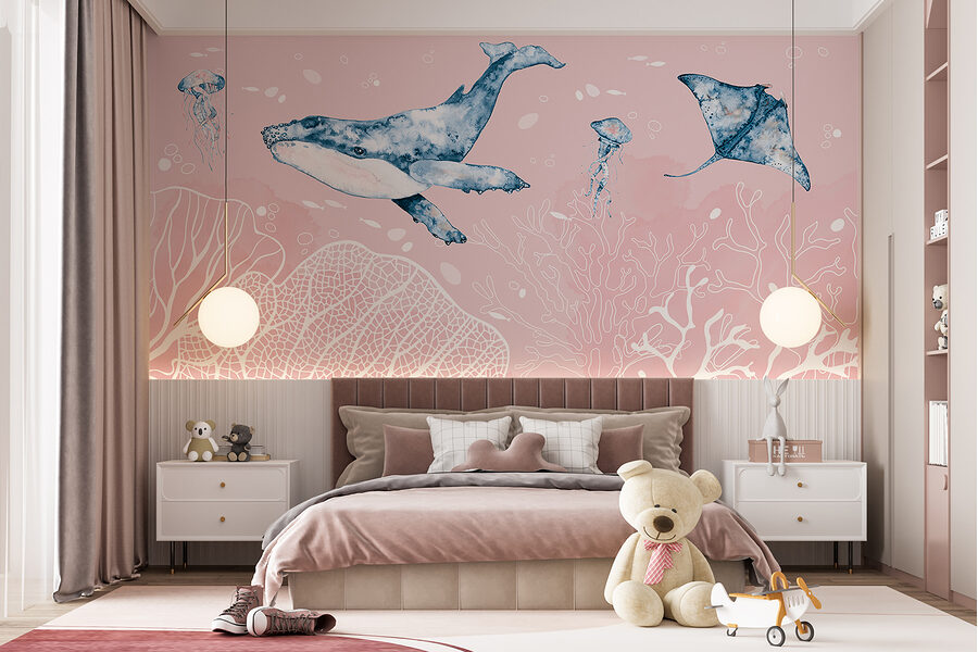 Imagine entrar numa sala e encontrar-se perdido num mundo subaquático sereno. O nosso mural de parede “Aguarela de uma baleia” é como ter uma fatia do oceano mesmo na sua parede. Os tons pastel de sonho misturam-se sem esforço, trazendo uma sensação de calma e capricho. Uma baleia elegante, medusas graciosas e arraias curiosas flutuam, fazendo-o sentir como se tivesse mergulhado num mar mágico.