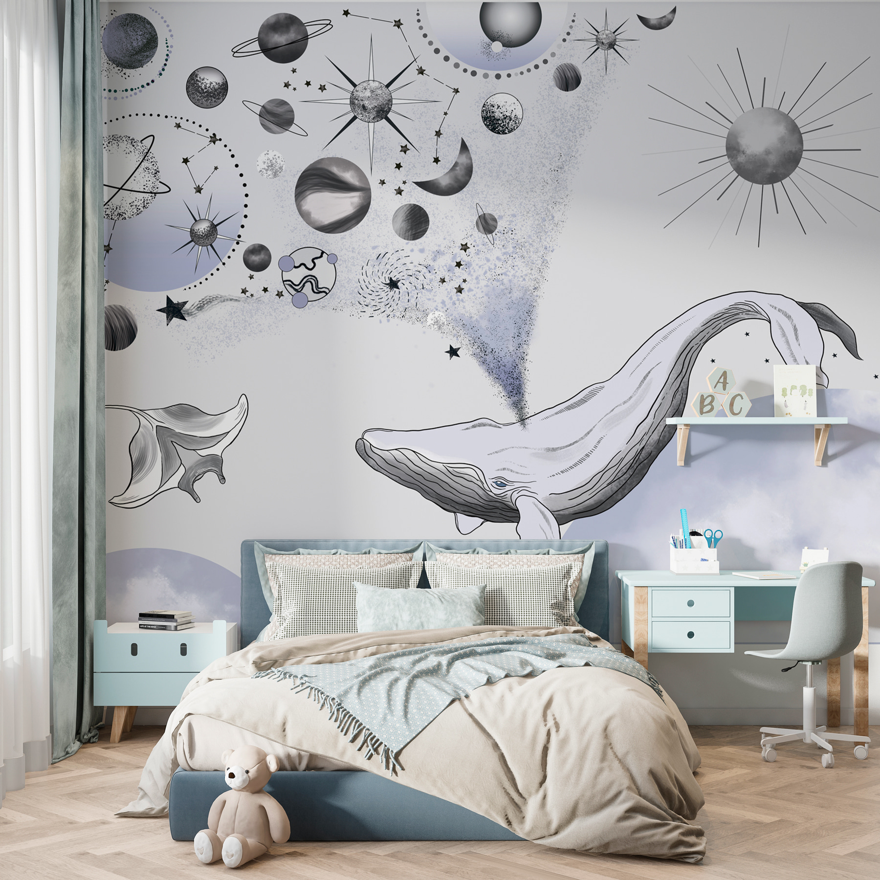 Transforme qualquer espaço com este mural de parede que parece um passeio por um país das maravilhas de sonho. Imagine uma baleia gentil a deslizar pelo cosmos, rodeada por redemoinhos de magia estrelada e planetas divertidos. A vibração a preto e branco dá-lhe um toque moderno que se adapta a qualquer lugar, desde um quarto de crianças a um recanto de leitura acolhedor. É como um início de conversa, evocando devaneios de profundezas oceânicas e céus estrelados. Imagine-se a enrolar-se com um bom livro, a olhar para este mural e a sentir aquela centelha de imaginação. Perfeito para aqueles que adoram uma pitada de capricho na sua decoração!