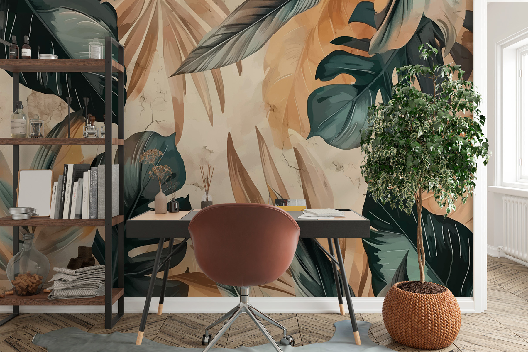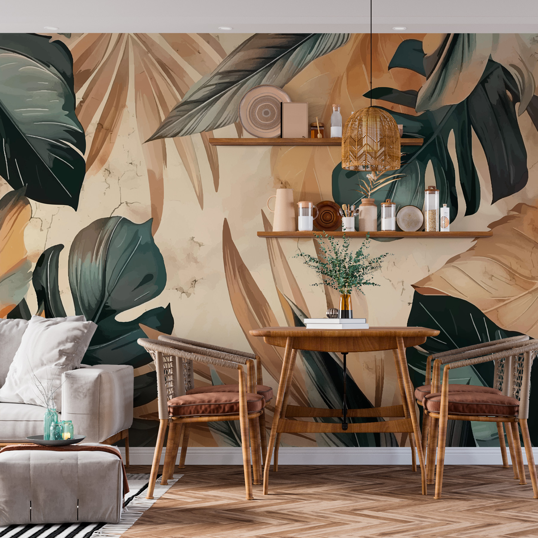 Junte-lhe alguns móveis de bambu, luzes de corda e talvez uma cama de rede… e pronto, está no paraíso. Por isso, se está à procura de respirar um pouco de ar fresco e tropical na sua casa, este mural está a chamar pelo seu nome. Mergulhe – os trópicos esperam-no!