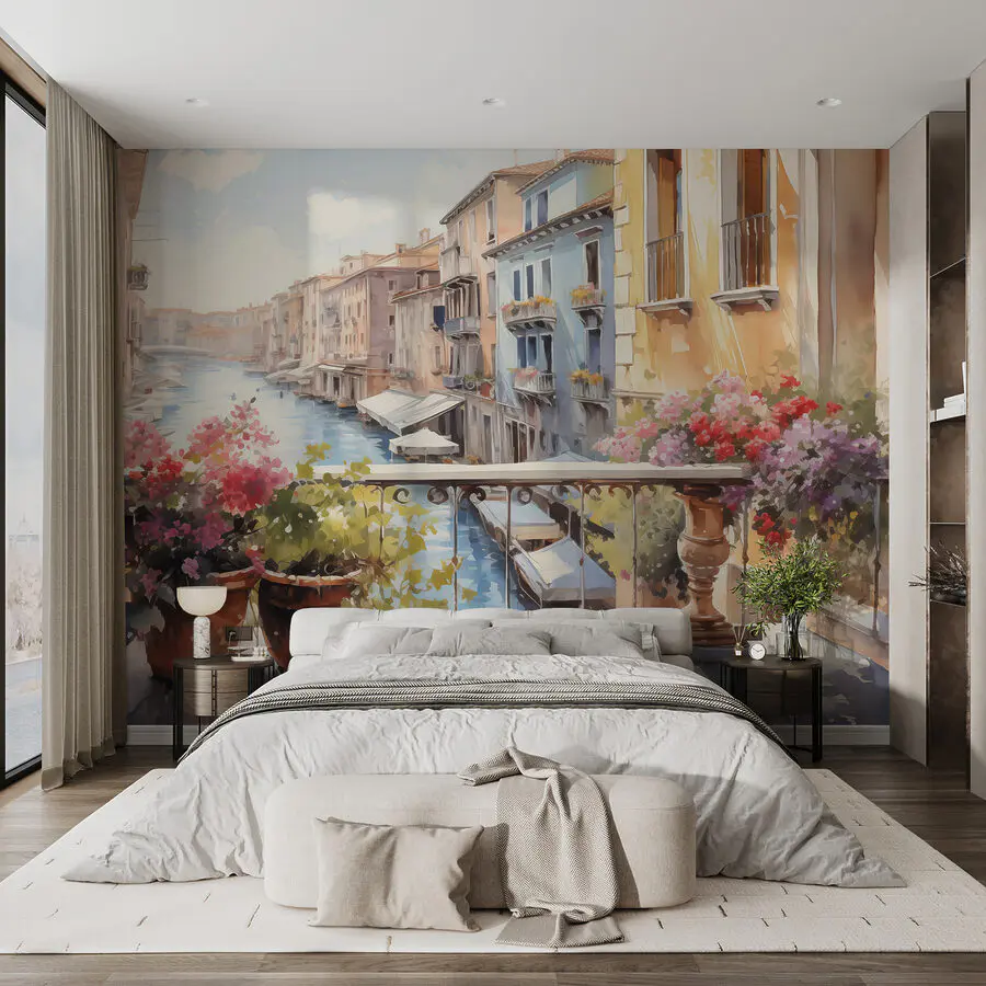 Imagine-se a relaxar na sua sala de estar, a beber café, e a sua parede leva-o para uma encantadora zona ribeirinha. É como magia! Este mural – pense em sussurros de aguarela com uma pitada de charme citadino – transforma qualquer espaço num refúgio artístico e acolhedor. Aquelas flores na varanda convidam a devaneios pacíficos ou a conversas animadas sobre a sua próxima aventura de viagem. Perfeito para quem gosta de um toque de natureza e arquitetura, não é apenas decoração – é uma porta para a serenidade. Quem diria que as paredes podiam conversar?