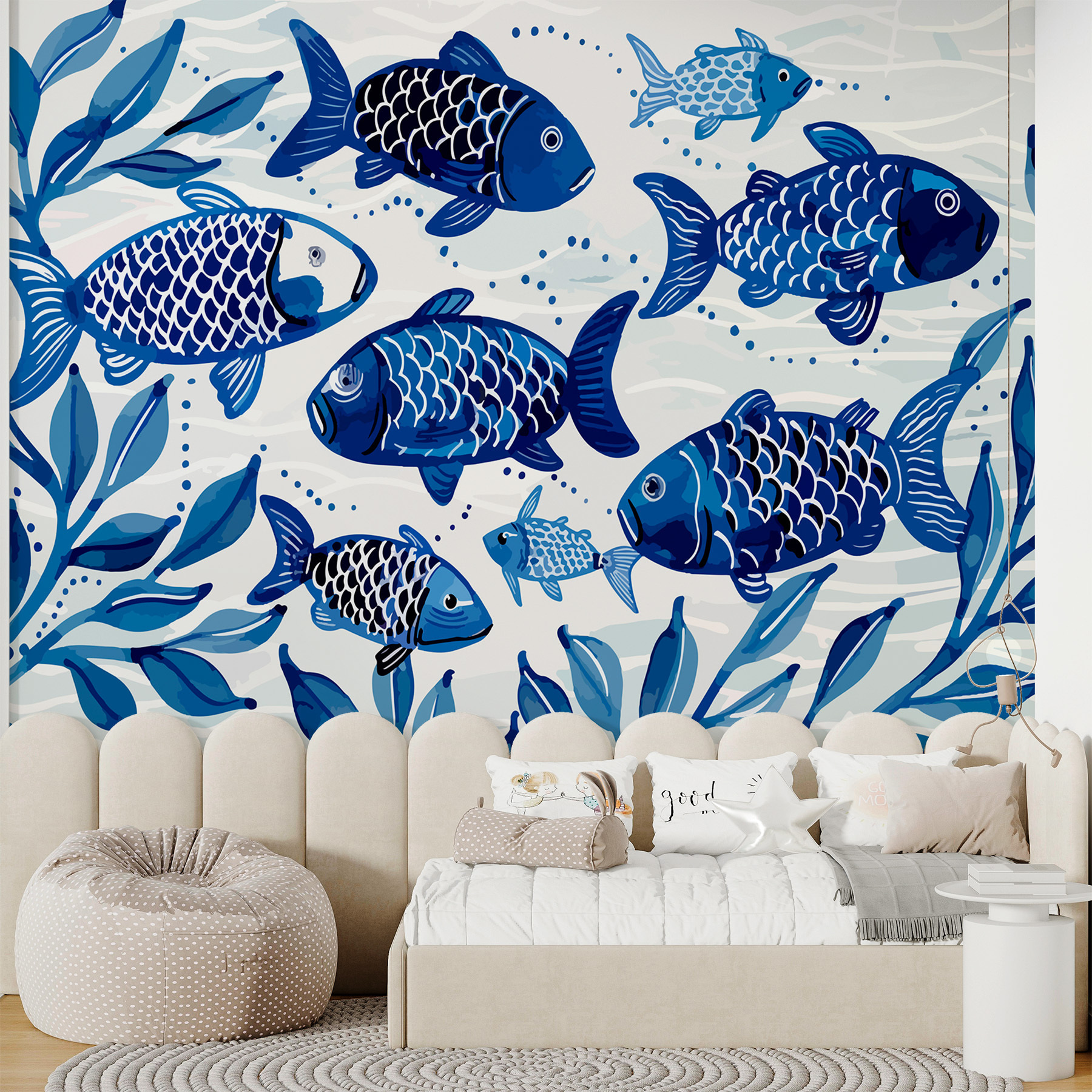 Imagine a sua parede transformada num país das maravilhas subaquático com um cardume de peixes azuis a deslizar sem esforço. Este mural é como um toque de magia do oceano – perfeito para aqueles que sonham com fugas à beira-mar. As vibrações da aguarela fazem com que se sinta quase como se estivesse a descansar com os dedos dos pés na areia, com uma suave brisa do mar a sussurrar segredos. Não se trata apenas de decoração; é uma pequena fuga sempre que se olha para ela. Ideal para uma sala de estar acolhedora ou para um quarto com tema de praia, é como ter o seu próprio aquário pessoal, sem o horário de alimentação!