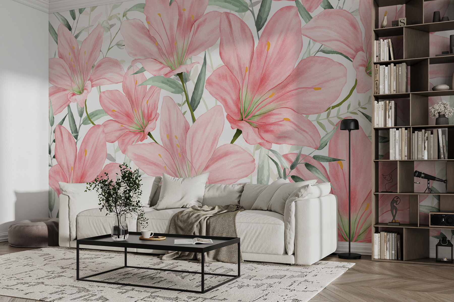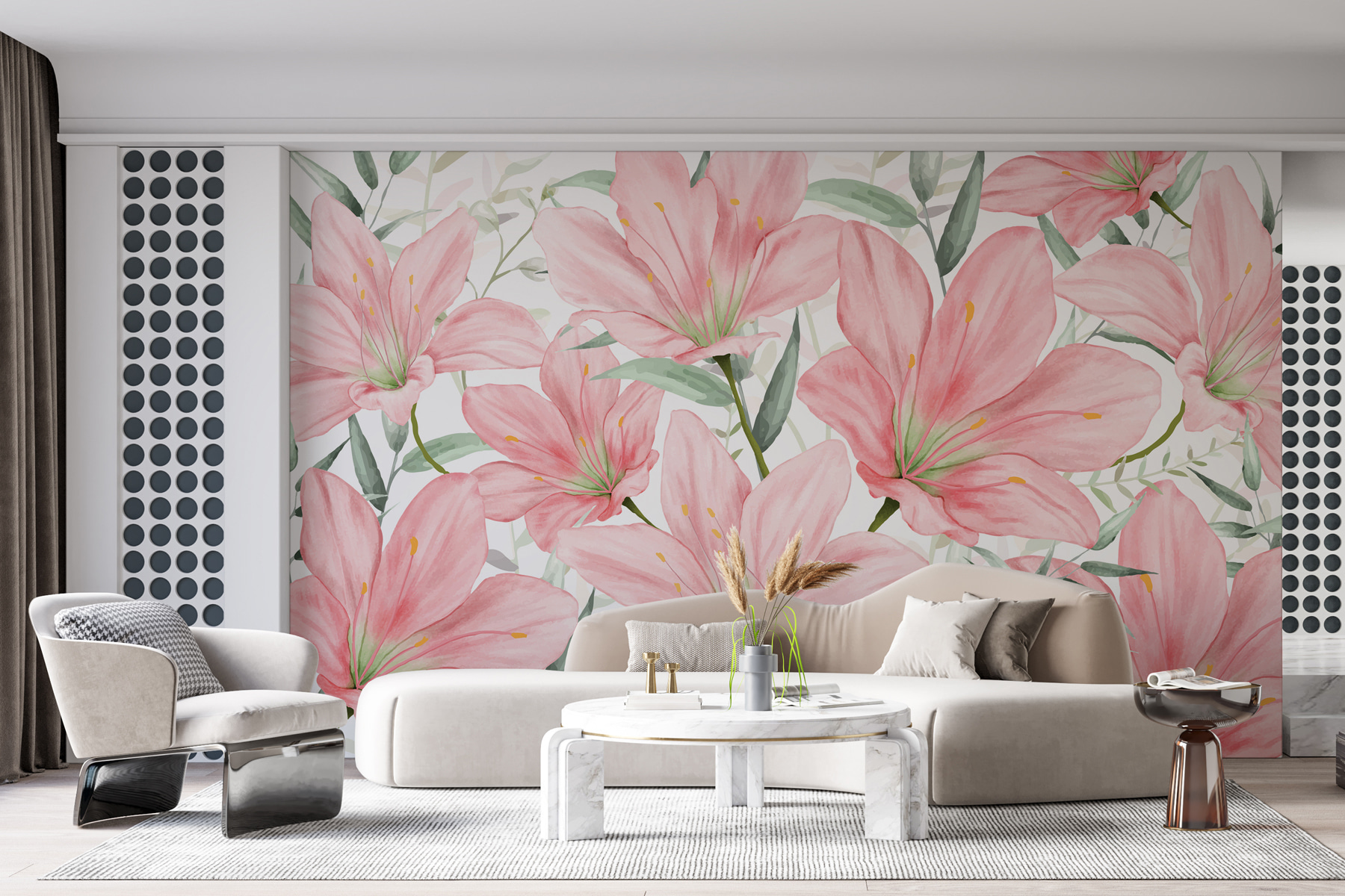 Imagine entrar numa sala onde cada parede sussurra um suave olá com lírios em flor, suavemente cor-de-rosa e elegantemente posicionados. Este mural – chamemos-lhe o ladrão de cena – traz um pouco da natureza para o interior, com um toque de conto de fadas. É como dar uma festa no jardim sem se preocupar com o tempo! Perfeito para quem gosta de uma mistura de arte e natureza, parece um abraço pessoal da própria Mãe Natureza. Os convidados podem até perguntar onde arranjou essa “obra de arte” deslumbrante – e você pode apenas sorrir, acenar com a cabeça com conhecimento de causa e deixar os lírios falarem.