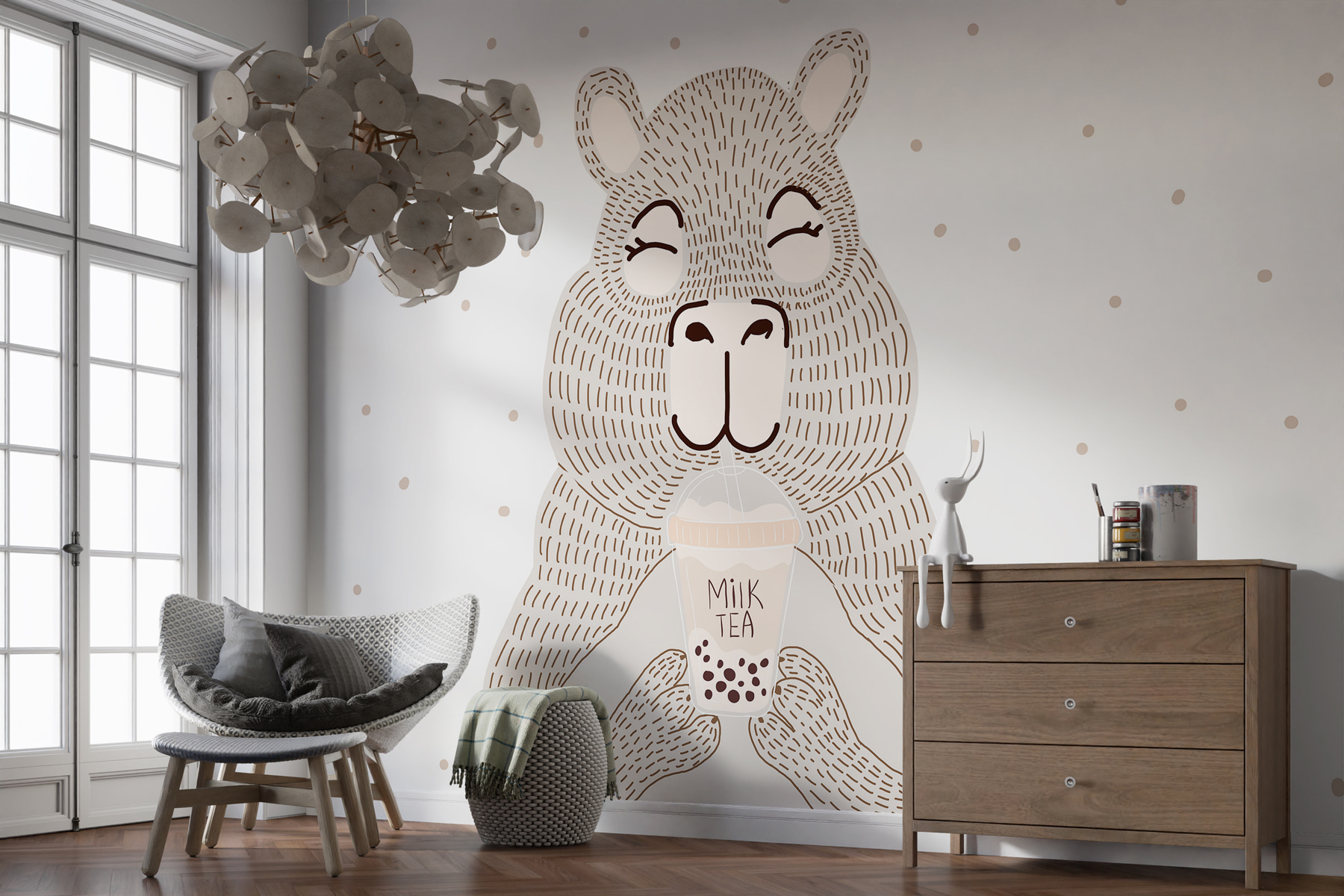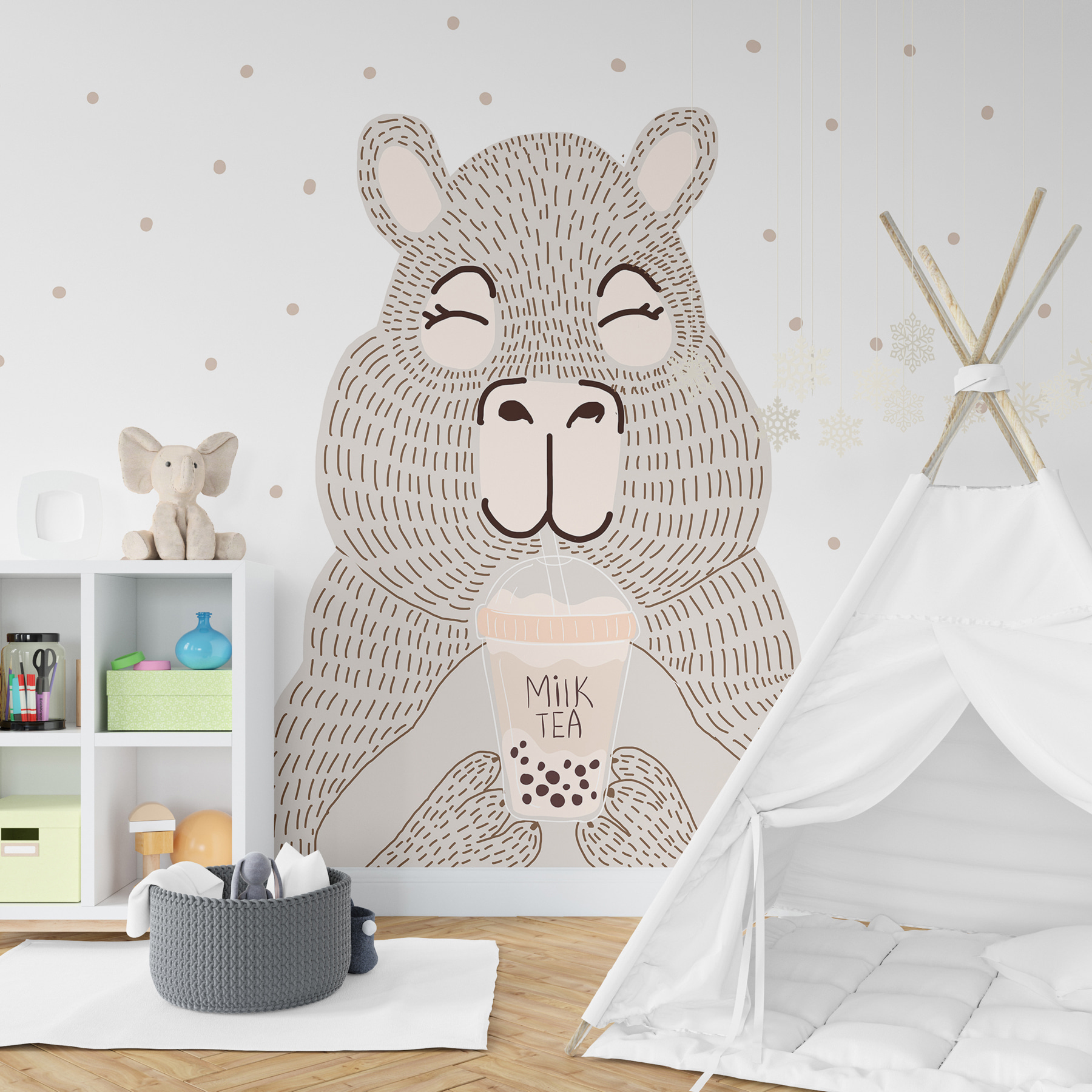 Quem poderia resistir a um urso que gosta de chá de bolhas? Este mural de desenhos animados dá um toque de capricho e calor a qualquer divisão. Imagine isto: entra depois de um longo dia e um urso encantador cumprimenta-o, bebendo um chá de bolhas com um sorriso sereno. É impossível não se sentir instantaneamente relaxado. Perfeito para um toque lúdico em quartos ou cafés peculiares. Quer seja um fanático por chá de bolhas ou apenas adore um bom amigo urso, este mural acrescenta uma vibração única e acolhedora ao seu espaço. Quem diria que um urso poderia ser um companheiro de quarto tão fixe?