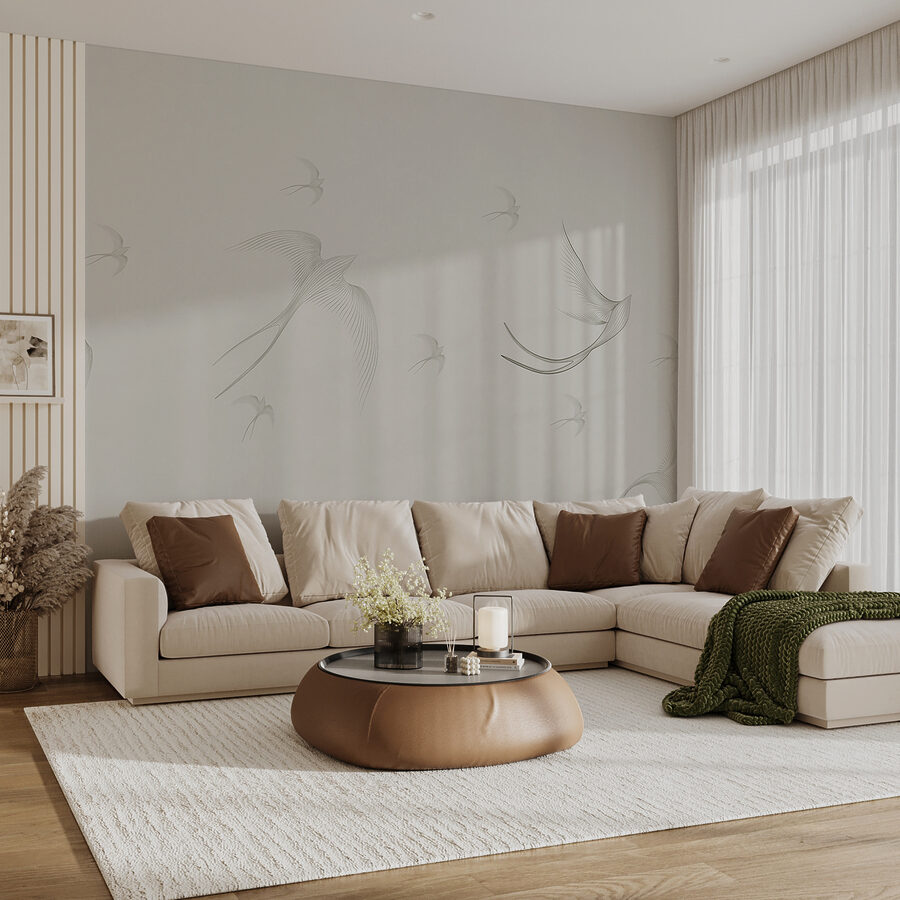 Este mural não é apenas bonito; acrescenta um toque de estilo contemporâneo que é perfeito para qualquer espaço moderno. Além disso, é versátil – encaixa-se perfeitamente, quer esteja a decorar um escritório em casa ou a dar um novo visual ao quarto. As linhas suaves e os tons suaves fazem com que pareça que os pássaros estão quase vivos, flutuando para dentro e para fora com uma sensação de liberdade que é contagiante.