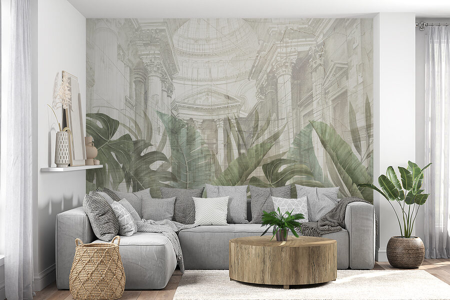 Transforme o seu espaço num oásis de sonho com este mural que apresenta uma folha exuberante e de grandes dimensões num cenário encantador. Imagine entrar numa sala e sentir-se instantaneamente animado, como se tivesse entrado num jardim sereno. A delicada interação de vegetação e arquitetura suave convida a uma vibração calmante, perfeita para relaxar com um bom livro ou receber amigos.