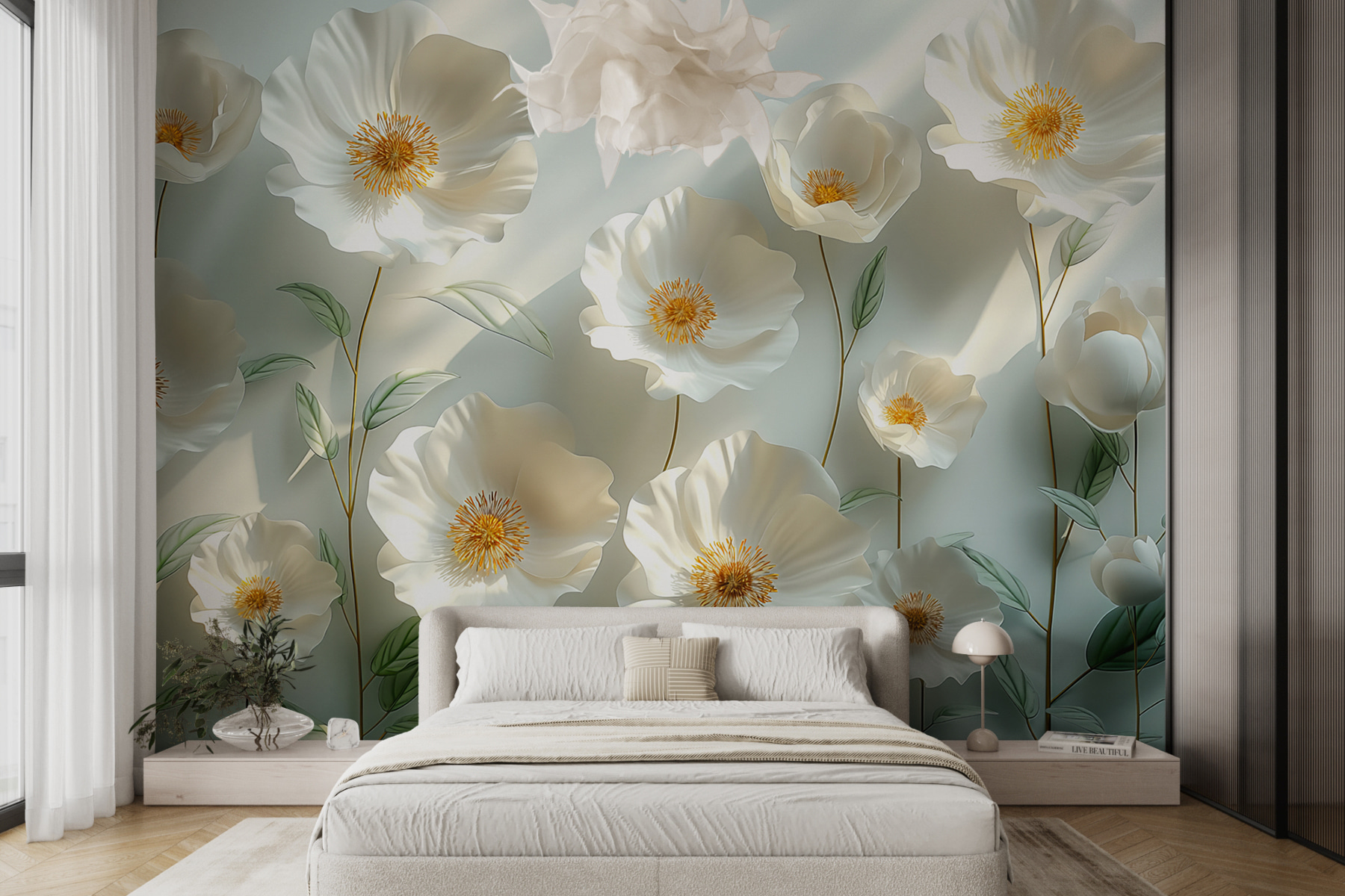 Transforme qualquer parede num refúgio de jardim com este mural deslumbrante que apresenta um belo grupo de flores brancas a brotar alegremente no meio de folhas verdes. Imagine acordar todos os dias e sentir que está a passear por um prado iluminado pelo sol. Estas flores acrescentam uma vibração fresca e calmante, perfeita para manhãs acolhedoras ou noites frias. Quer seja numa sala de estar, num quarto ou mesmo num espaço criativo, todos dirão: “Uau, olhem para isto!” Além disso, quem é que não gosta de flores que não precisam de ser regadas? A sua parede vai agradecer-lhe enquanto desfruta da sua beleza!