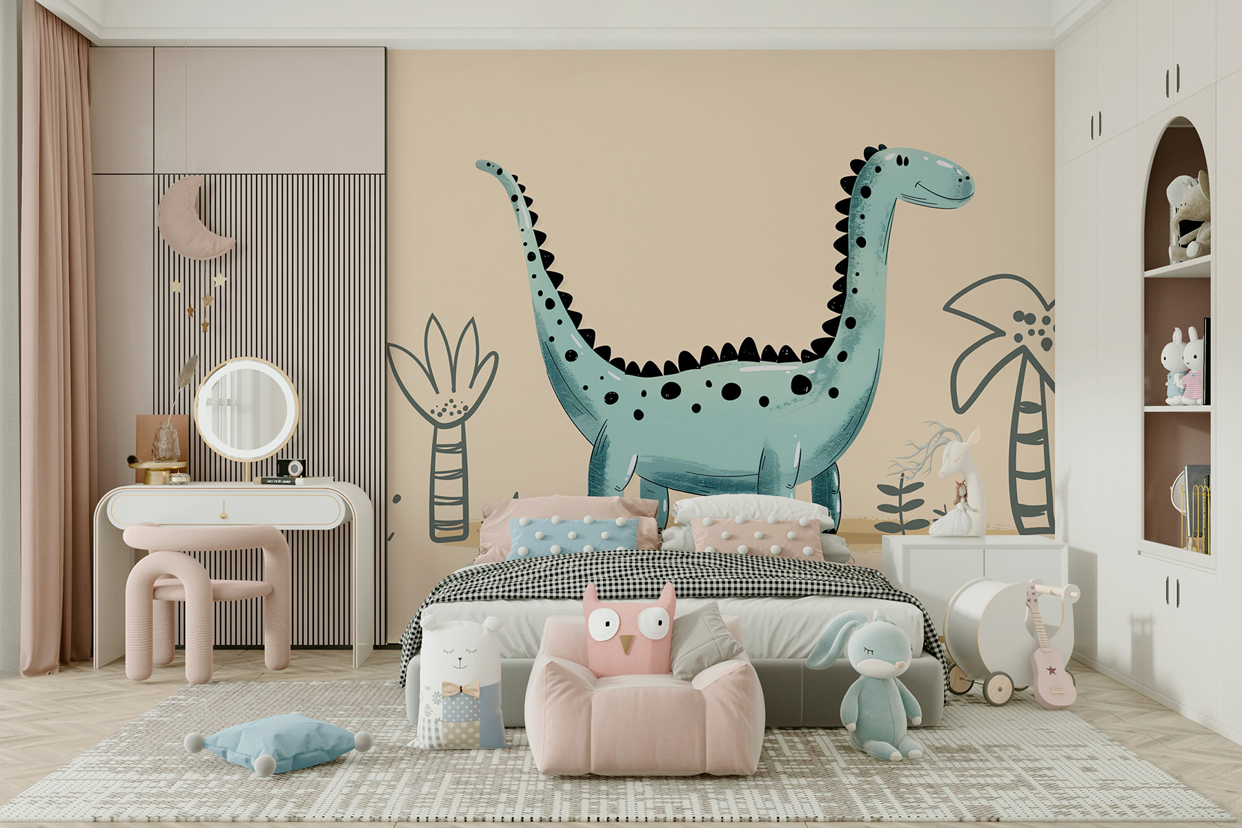 Imagine acordar com esta criatura feliz todas as manhãs… é como começar o dia com um abraço alegre! E aquelas plantas e palmeiras pequeninas? Só contribuem para o ambiente pré-histórico da selva – giro, não é? É o tipo de mural que pode transformar uma parede aborrecida numa deliciosa cena de um livro de histórias.