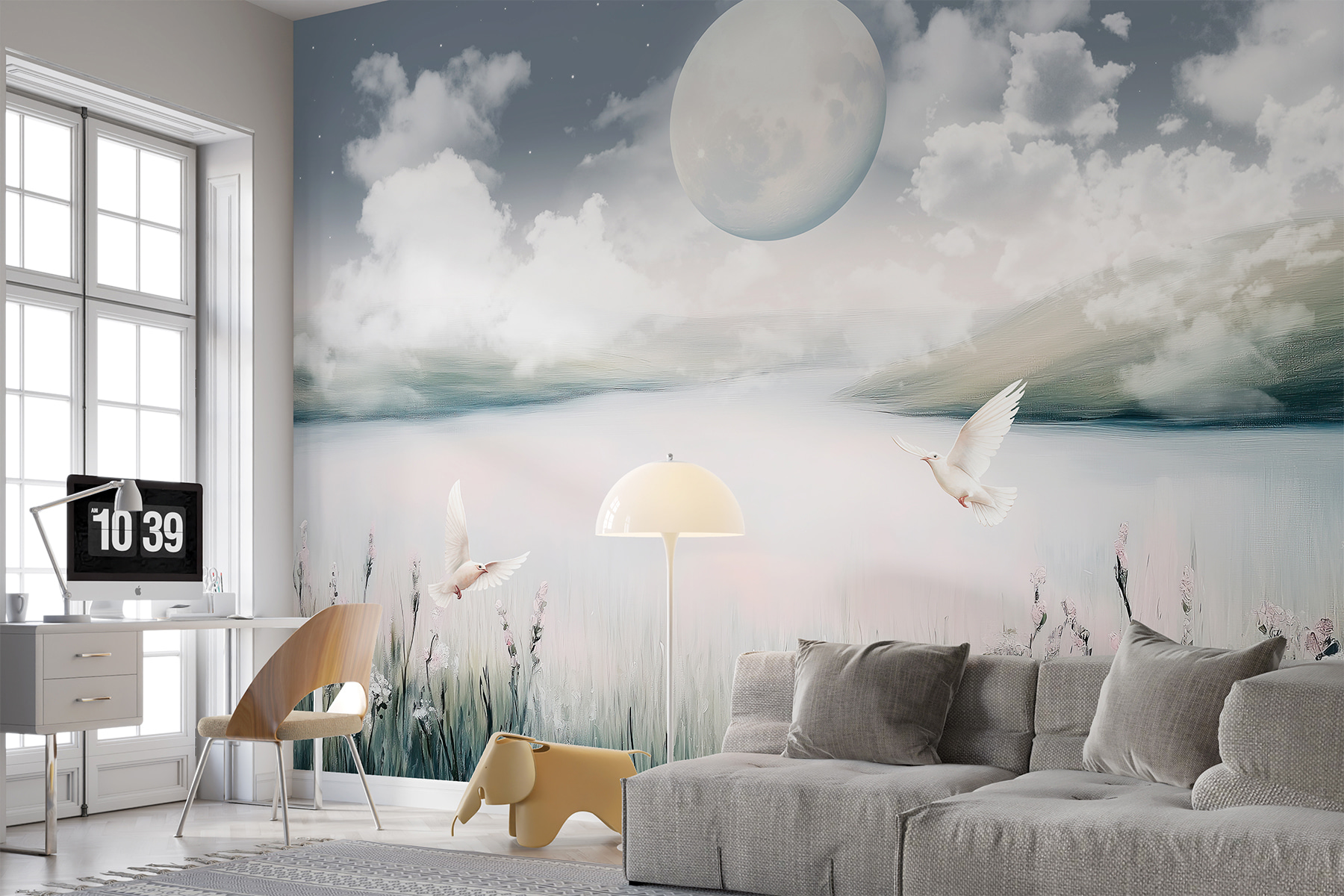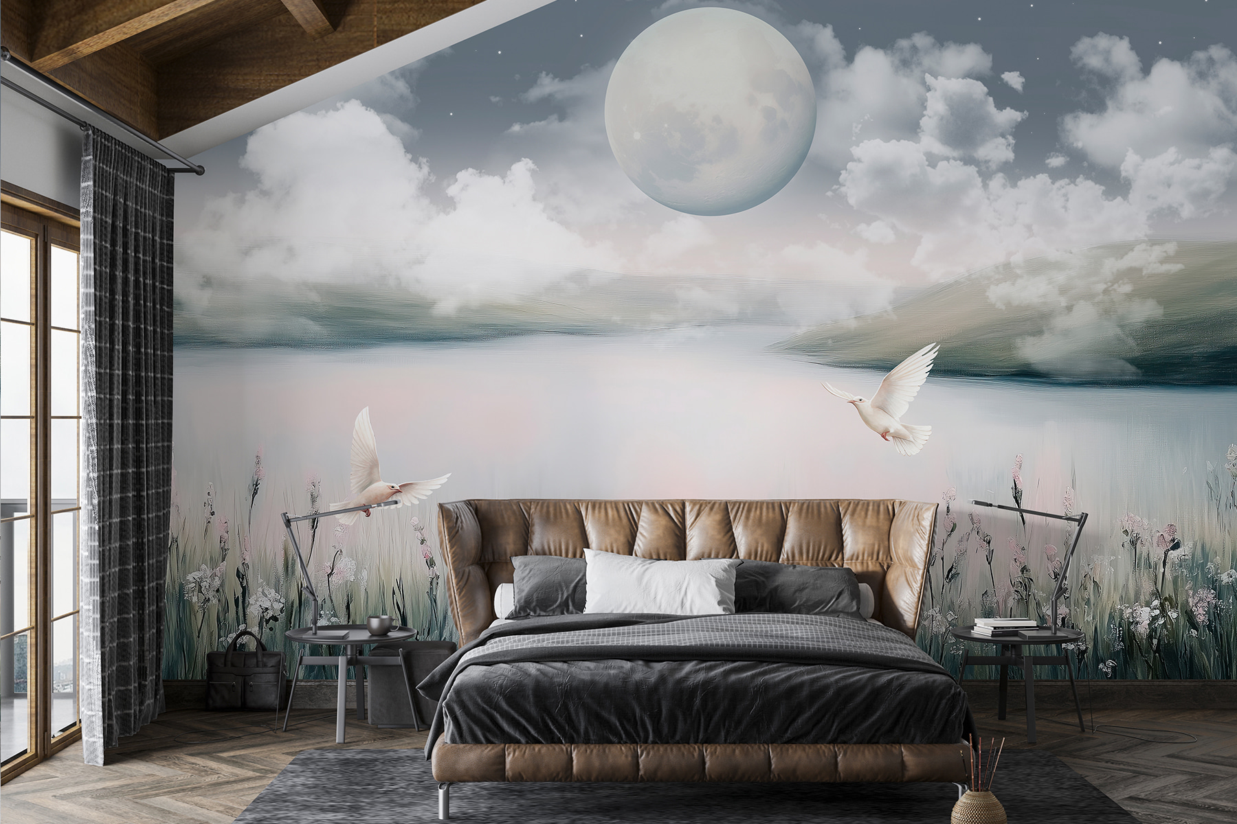 Imagine-se a relaxar no seu sofá, com uma chávena de chá na mão, e a sentir-se como se estivesse a flutuar nesta paisagem serena. As manhãs são tranquilas; os serões, absolutamente mágicos. É perfeito para quem gosta da natureza e quer um toque de capricho. Bónus? As flores em tons pastel e os pássaros dão o toque certo de charme sem serem demasiado exagerados. Definitivamente um iniciador de conversa no próximo jantar em família! 🌙✨