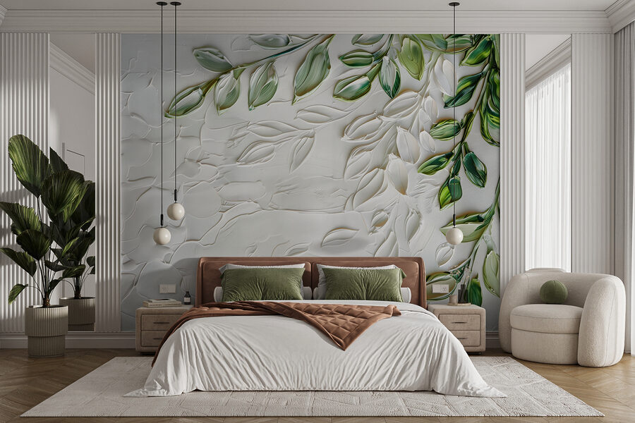 Olá, veja este mural de parede cativante (w01470)! É como entrar num jardim sereno sempre que se entra na sala. O mural apresenta delicadas folhas verdes com um efeito 3D tão fixe – quase parece que se pode estender a mão e tocar-lhes. Perfeito para quem gosta de decoração inspirada na natureza com um toque especial.