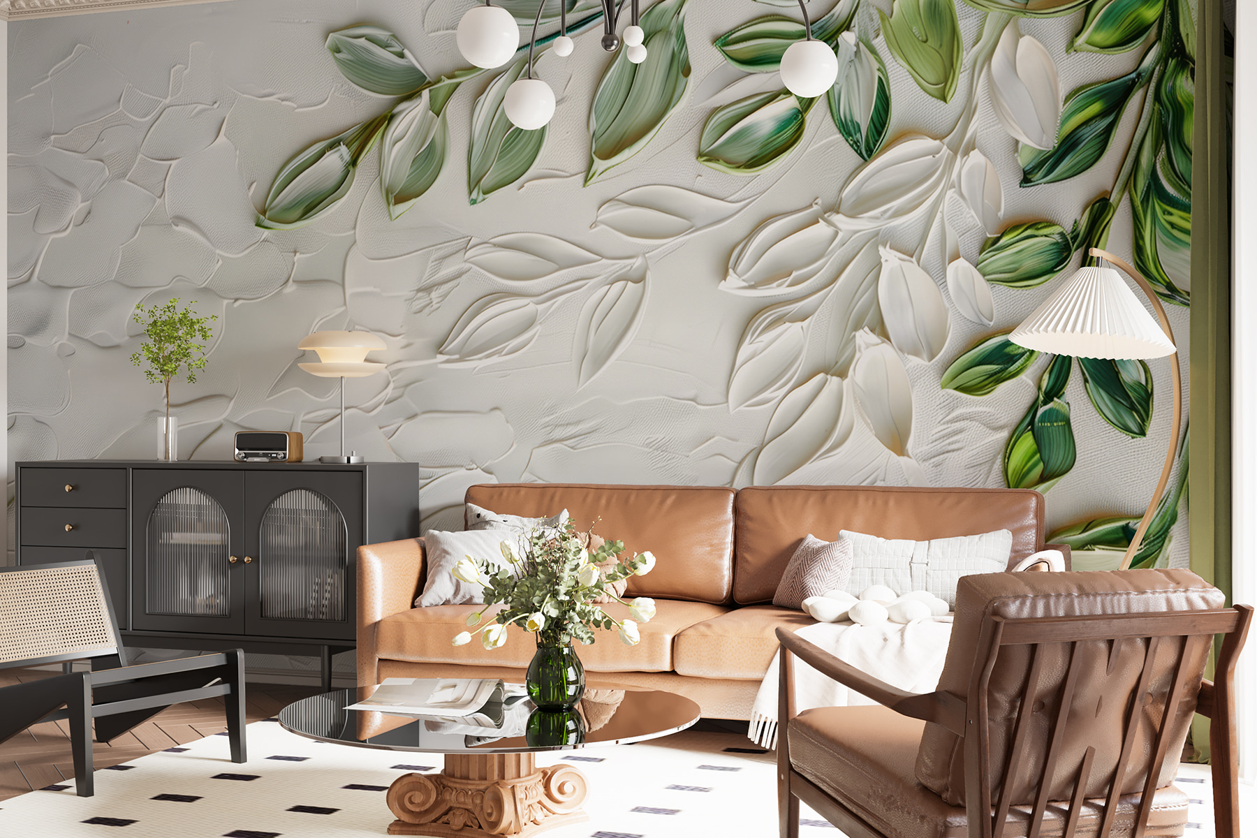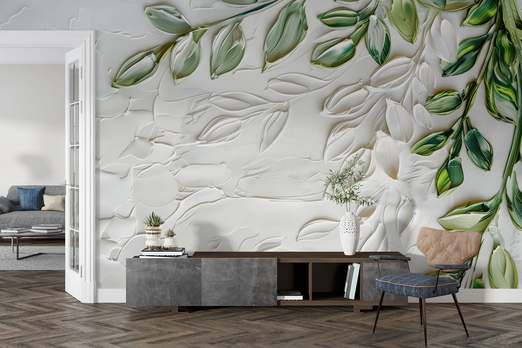 Olá, veja este mural de parede cativante (w01470)! É como entrar num jardim sereno sempre que se entra na sala. O mural apresenta delicadas folhas verdes com um efeito 3D tão fixe – quase parece que se pode estender a mão e tocar-lhes. Perfeito para quem gosta de decoração inspirada na natureza com um toque especial.
