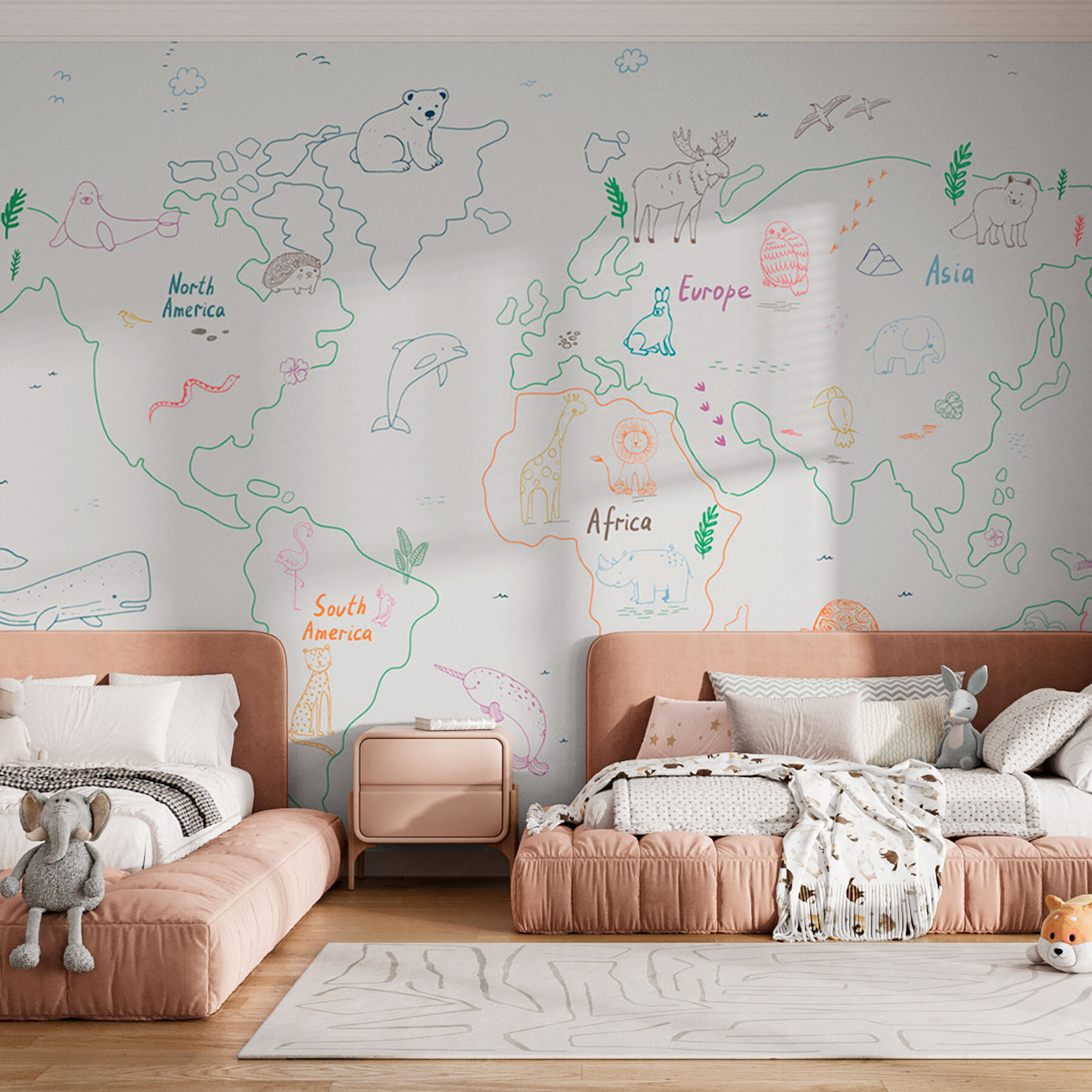 Imagine acordar com uma aventura todas as manhãs com o Papel de parede w01502v1! É um delicioso toque de capricho, misturando mapas da terra com encantadores rabiscos de animais. Perfeito para um quarto de criança ou para quem tem um coração jovem. Cada continente tem a sua própria tripulação criativa – leões a descansar em África, pinguins a relaxar na Antárctida e muito mais. Os amigos e a família vão adorar traçar estas ilustrações divertidas com os dedos, despertando a curiosidade sobre o nosso mundo. É uma mistura de educação e arte – como uma aconchegante caça ao tesouro global diretamente na sua parede!