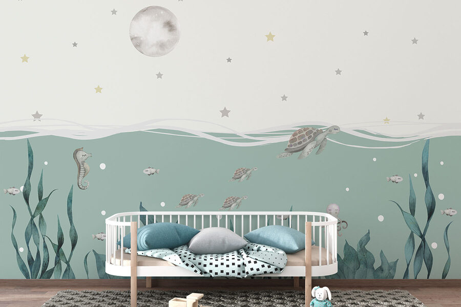 Imagine mergulhar num mundo subaquático sereno sempre que entra na sala. Este mural “Seaweed & Seahorses” capta a dança suave das criaturas marinhas sob um céu noturno estrelado. É como se as suas paredes tivessem dado um delicioso mergulho no oceano. Perfeito para qualquer espaço que precise de um toque de capricho ou de uma vibração calmante. Além disso, quem é que não quer ver pequenas tartarugas a deslizar enquanto bebe o café da manhã? Vá em frente – adicione um toque de maresia à sua decoração e deixe a sua imaginação nadar livremente!