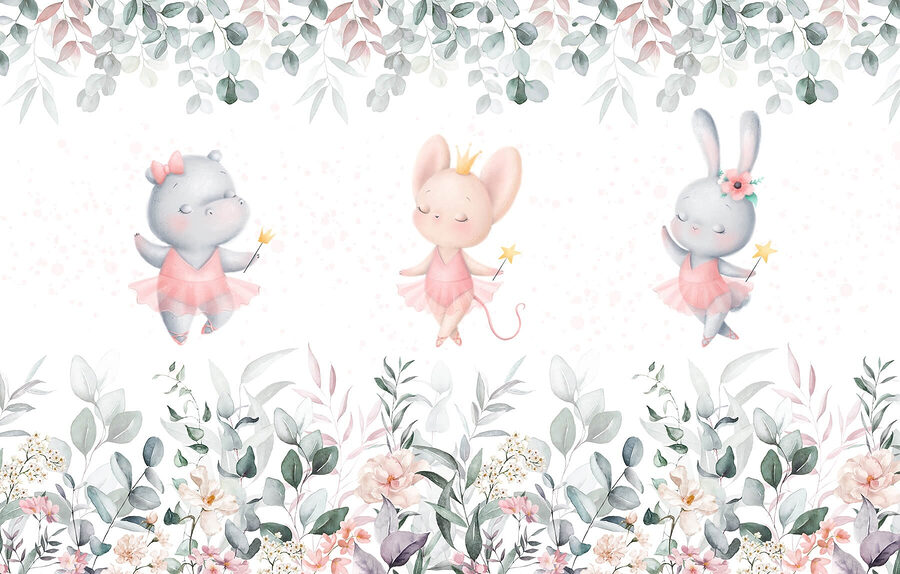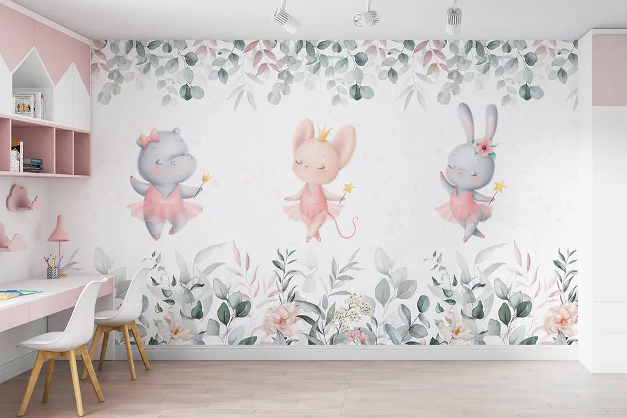 Transforme o espaço de qualquer criança num país das maravilhas caprichoso com este mural encantador que apresenta animais adoráveis com saias tutu cor-de-rosa! Imagine um hipopótamo feliz, um rato encantador e um coelhinho doce, todos a dançar sob uma chuva de flores. É como um ballet alegre sem necessidade de sapatos de dedo do pé. Este mural não é apenas uma decoração; desperta a imaginação e as gargalhadas, tornando-o perfeito para salas de jogos ou infantários. Imagine um pequenote a rodopiar, inspirado pela fofura das paredes, sentindo-se uma superestrela. Quem não gostaria de se juntar a essa diversão? É uma doce recordação da magia da infância, polvilhada com um toque de encanto floral. Perfeito para quem procura trazer um sorriso a qualquer divisão!