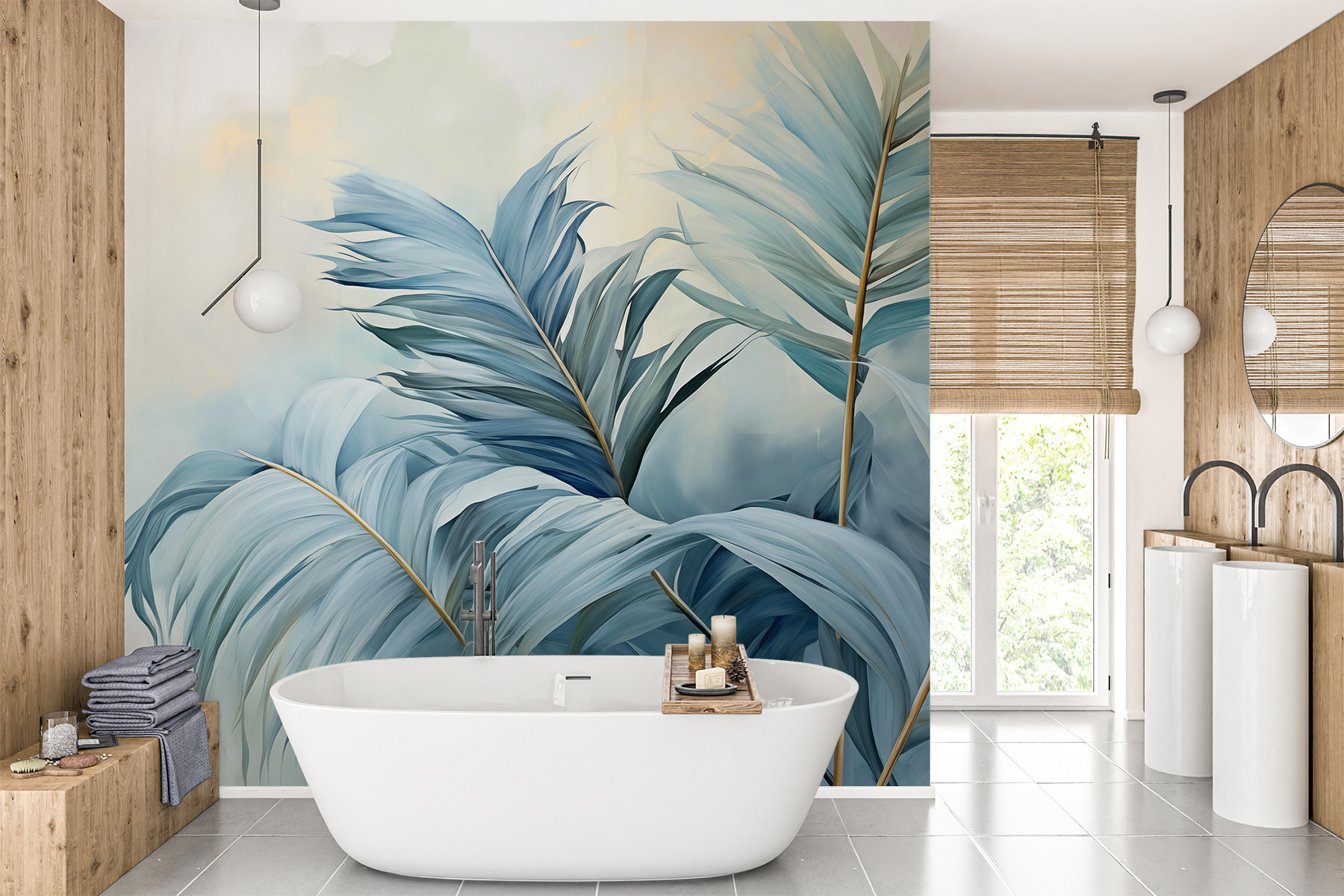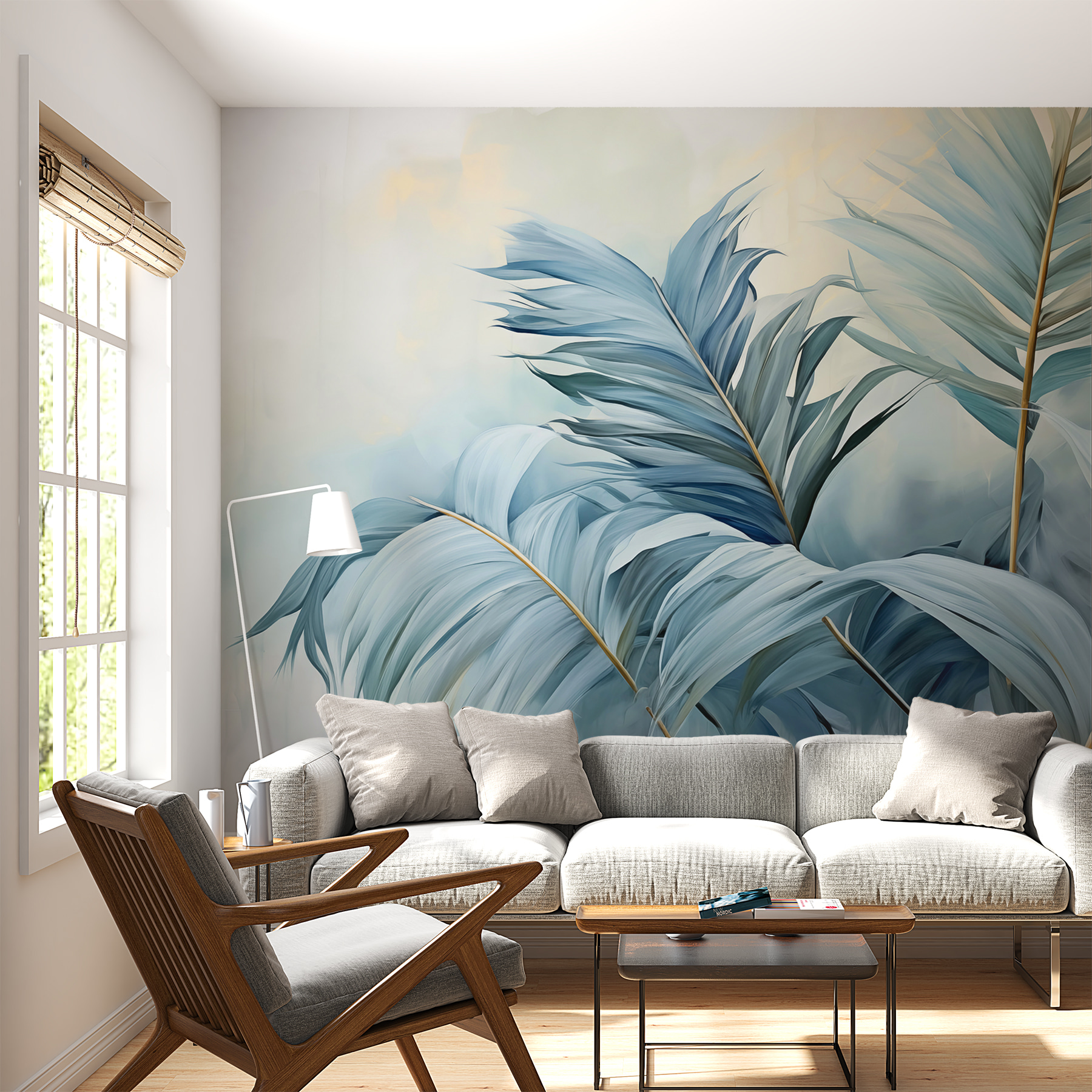Imagine acordar com os “Whispers of Blue Palms” todas as manhãs – é como entrar numa selva serena, mesmo na sua sala de estar. Os azuis e verdes calmantes são perfeitos para criar um canto zen onde pode saborear o seu café matinal ou descontrair após um longo dia. Pode até começar a pensar que o seu espaço tem as suas próprias vibrações de retiro exótico. Os pássaros vão ficar com inveja destas folhas! Além disso, é tão versátil – funciona com quase todos os estilos de decoração. Transforme uma parede simples numa fuga suave envolta nos tons mais suaves da natureza.