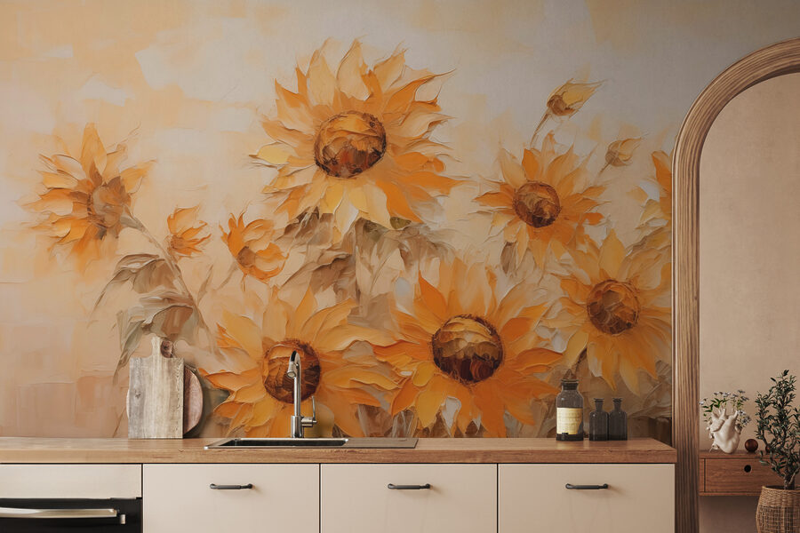 Transformar uma divisão com este mural de girassóis é como convidar um jardim solarengo para dentro de casa. Imagine acordar com estas flores vibrantes – é como um nascer do sol alegre sem o despertador. Cada girassol parece dançar ao sabor da brisa, trazendo um toque de calor e alegria às paredes. Perfeita para um recanto acolhedor ou para iluminar um corredor sem graça, esta obra de arte sussurra felicidade. Os amigos podem até parar a meio de uma conversa para admirar os amarelos brilhantes e os tons suaves. É um pequeno pedaço da natureza, que transforma qualquer espaço num oásis de alegria. Não é animador?