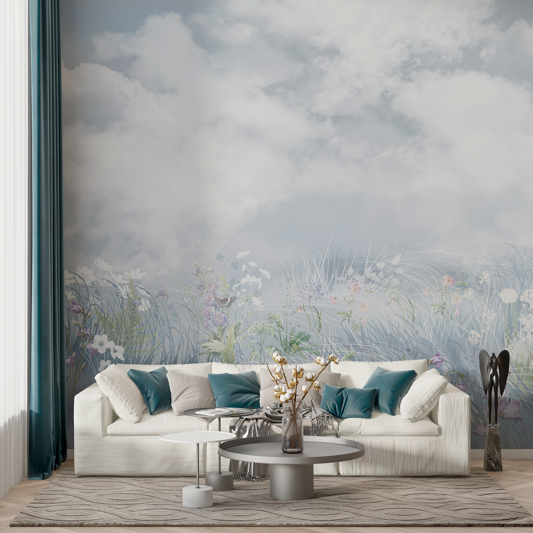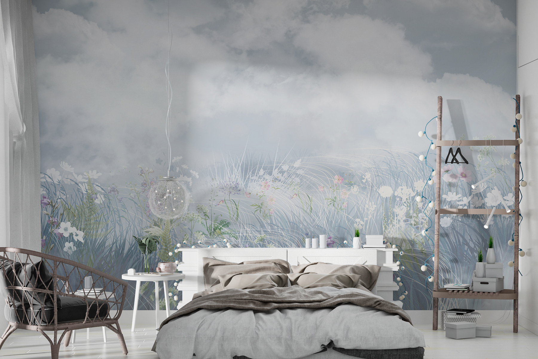 Imagine acordar com um campo de flores todos os dias – sem nunca sair da sua cama confortável. Este mural tem nuvens tão fofas que praticamente se desprendem da parede, e flores silvestres que parecem florescer diante dos seus olhos. É como um sonho de aguarela na sua parede. Perfeito para aqueles que desejam dormir a sesta num prado (menos as formigas). Tem esta forma mágica de abrir uma divisão, tornando-a calma e arejada. Uma fuga perfeita. Com o chá na mão, pode esquecer-se que está em casa. É uma felicidade, não é?