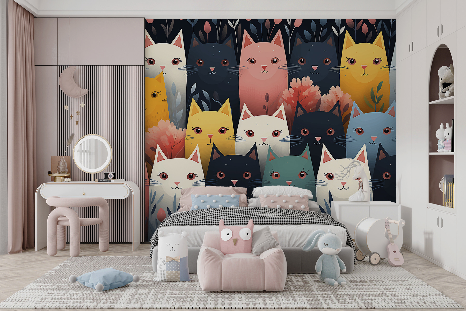 Quer dar um toque de capricho ao seu espaço? Veja este mural de parede divertido chamado “Grupo de Gatos com Flores”. Imagine um grupo de gatinhos coloridos – rosas brilhantes, verdes e amarelos – aninhados entre flores alegres. É como uma festa no jardim, mas com gatos! Perfeito para quem adora um toque de cor e uma pitada de alegria. Estes amigos felinos trazem charme e uma pitada de malícia a qualquer divisão, fazendo cócegas no seu espírito criativo sempre que passa por eles. Está a pensar em criar um recanto acolhedor? Estes gatos têm as suas costas – ou pelo menos a sua parede!