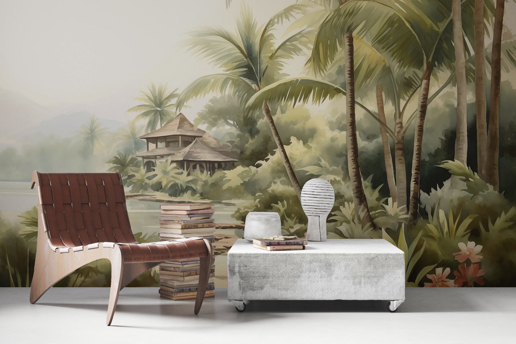 Imagine entrar na sua sala de estar e ser recebido pelo seu próprio paraíso tropical. Este mural de aguarela, com a sua casa de sonho aninhada entre palmeiras, não fica apenas pendurado na parede – transforma o seu espaço numa fuga exótica. Poderá sentir uma brisa quente ou a vontade de beber uma bebida frutada! Perfeito para adicionar um toque de capricho e tranquilidade, este mural é o melhor início de conversa. Além disso, tem aquela vibração descontraída – como se a sua casa tivesse decidido que precisava de umas férias permanentes. Quem é que não quereria isso?