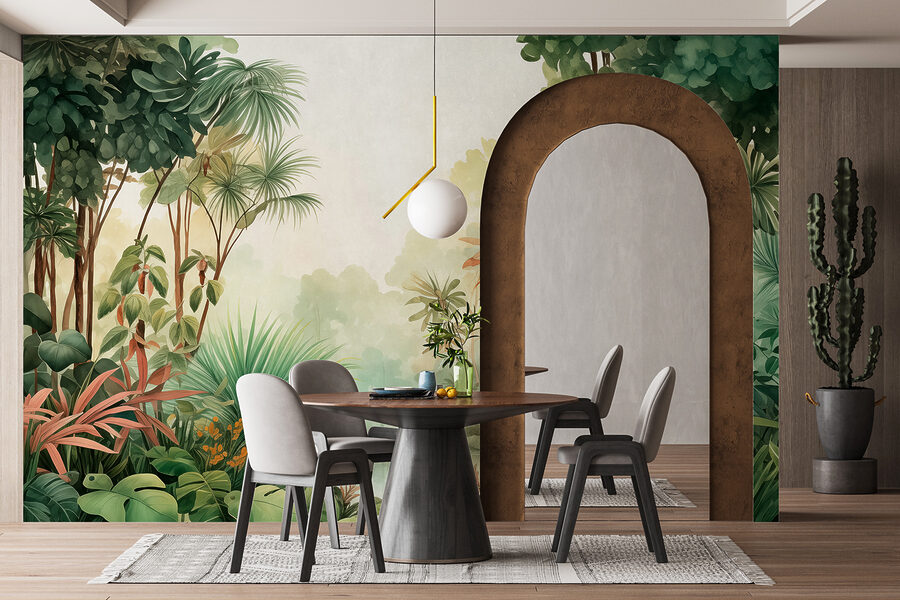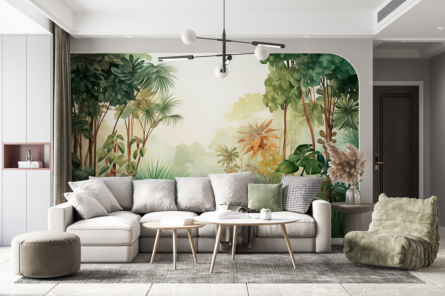 Imagine entrar numa sala e ser imediatamente levado para uma floresta serena de aguarela. Este mural, amigos, traz essa vibração exuberante da selva diretamente para as suas paredes! Não é apenas uma imagem – é uma fuga. Os tons verdes parecem sussurrar calma – perfeitos para descontrair depois de um dia agitado. Imagine um dia chuvoso enrolado com o seu livro favorito, ou até mesmo uma reunião com amigos que não conseguem parar de admirar o seu oásis florestal. Faz com que as paredes pareçam estar a dar-lhe um abraço suave e cheio de folhas.