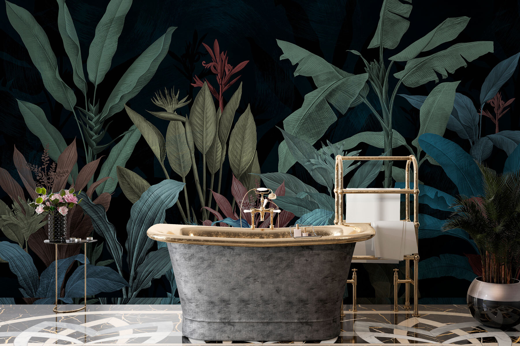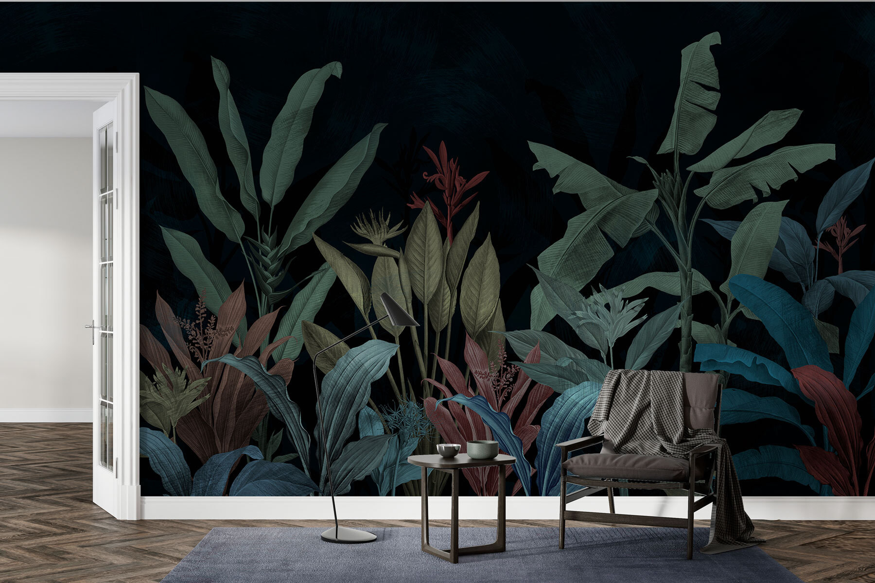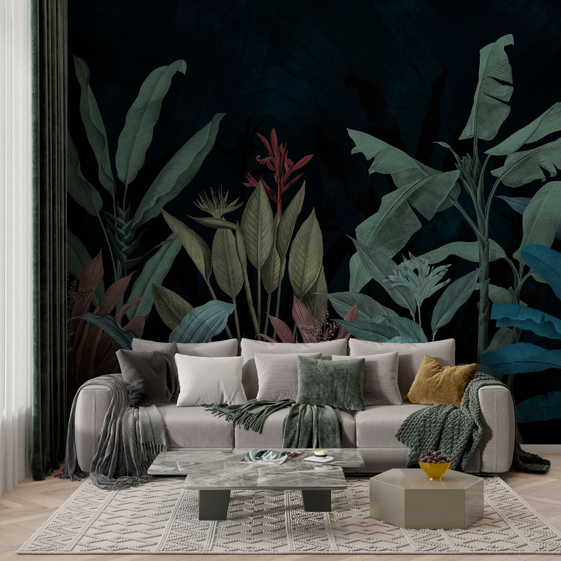 Imagine entrar numa sala e sentir-se como se tivesse entrado numa encantadora selva nocturna. É isso que “Nighttime Serenade in Green and Blue” oferece. Este mural não é apenas um revestimento de parede – é um ambiente. Verdes e azuis ricos tocam juntos como uma sinfonia nocturna silenciosa, perfeita para um local onde pode descontrair. Imagine isto: teve um longo dia e só quer descontrair. Estas folhas exuberantes embalam-no nos seus braços, sussurrando histórias de trópicos distantes. É como uma aventura longínqua, sem o jet lag.