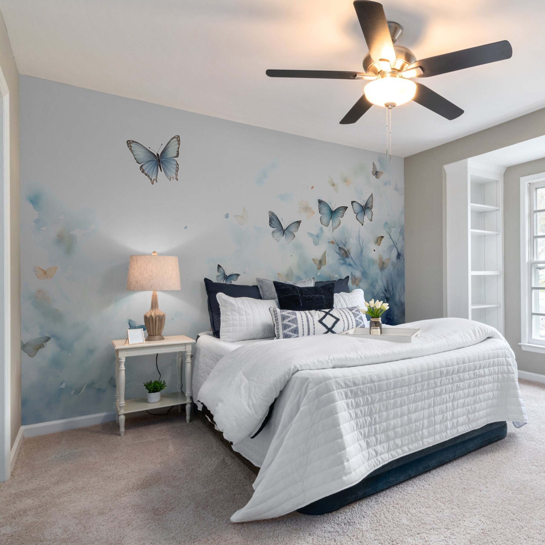 Imagine entrar num mundo onde as borboletas dançam graciosamente num céu de aguarela – parece um sonho, certo? Este mural traz exatamente essa vibração para o seu espaço. É como ter uma peça de arte da natureza dentro de casa. Os azuis suaves e as vibrações suaves criam uma atmosfera calma e encantadora. Perfeito para aqueles momentos em que só quer sentar-se e deixar a sua mente vaguear. Imagine uma tarde chuvosa, uma chávena de chá na mão e estas borboletas a darem um toque de magia. É como um sonho acordado, mesmo na sua parede.