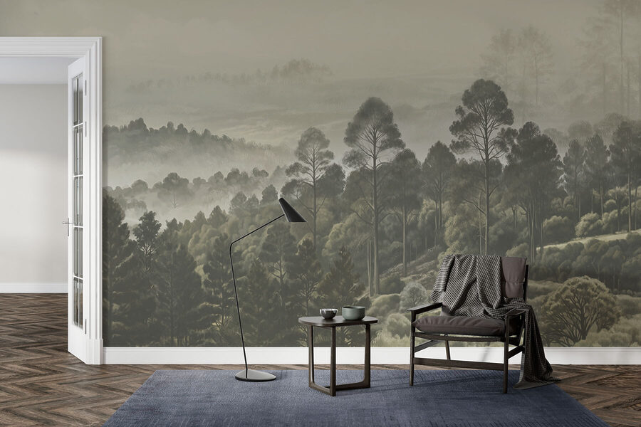 Imagine estar a beber café na sua sala de estar, mas em vez de olhar para uma parede simples, tem este mural de sonho com árvores e nevoeiro. É como estar envolvido num passeio matinal acolhedor e enevoado pela floresta – sem os insectos, claro. Os verdes silenciosos e os cinzentos suaves parecem um abraço suave, criando a zona de relaxamento perfeita. Pode até esquecer-se que está dentro de casa. Não se trata apenas de um mural de parede; é uma vibração. Uma fuga subtil sem nunca sair de casa. Só não se surpreenda se os seus convidados demorarem um pouco mais!