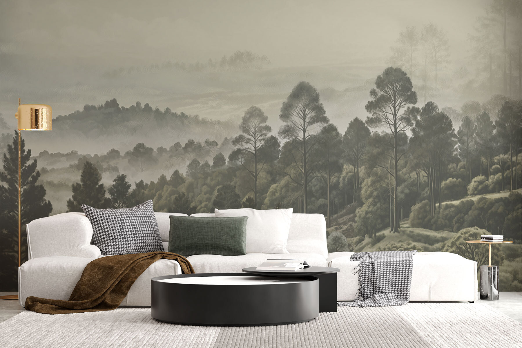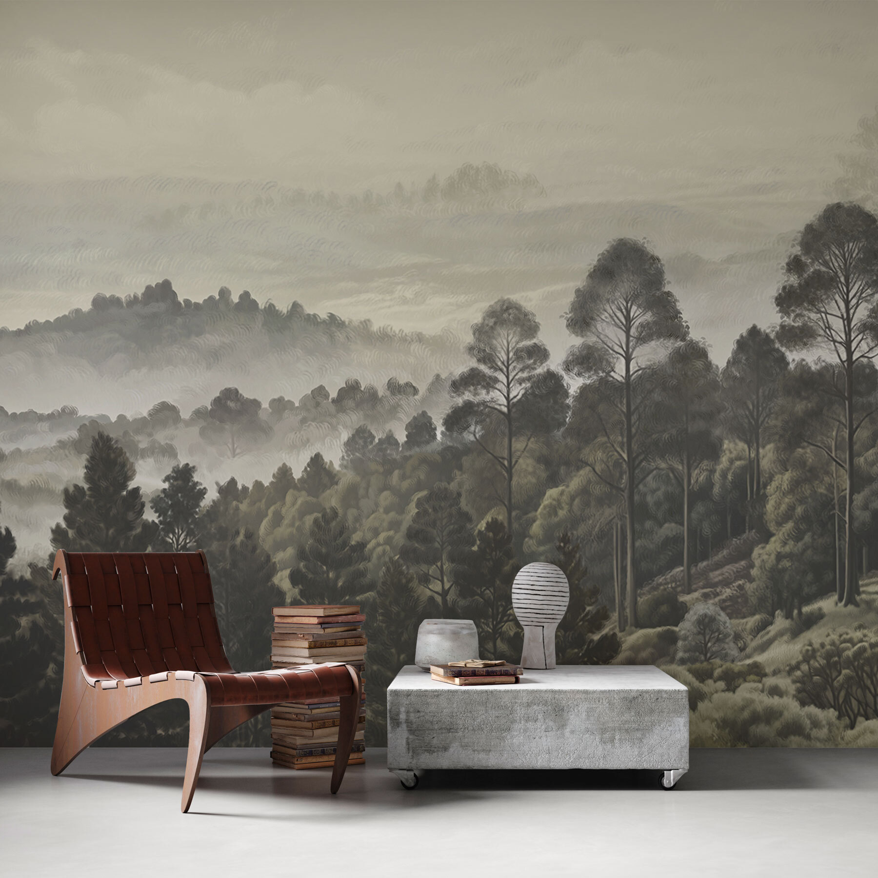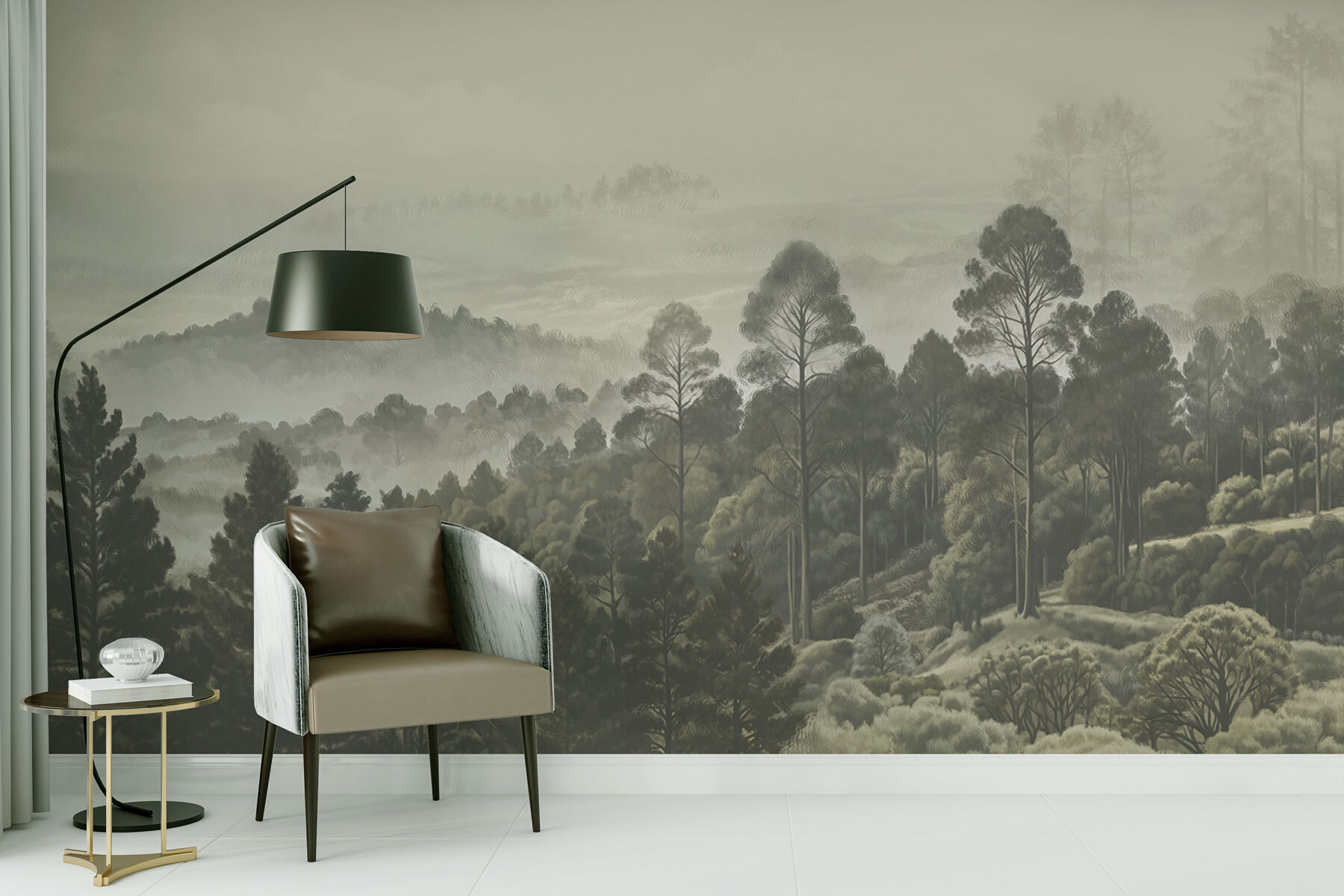 Imagine estar a beber café na sua sala de estar, mas em vez de olhar para uma parede simples, tem este mural de sonho com árvores e nevoeiro. É como estar envolvido num passeio matinal acolhedor e enevoado pela floresta – sem os insectos, claro. Os verdes silenciosos e os cinzentos suaves parecem um abraço suave, criando a zona de relaxamento perfeita. Pode até esquecer-se que está dentro de casa. Não se trata apenas de um mural de parede; é uma vibração. Uma fuga subtil sem nunca sair de casa. Só não se surpreenda se os seus convidados demorarem um pouco mais!
